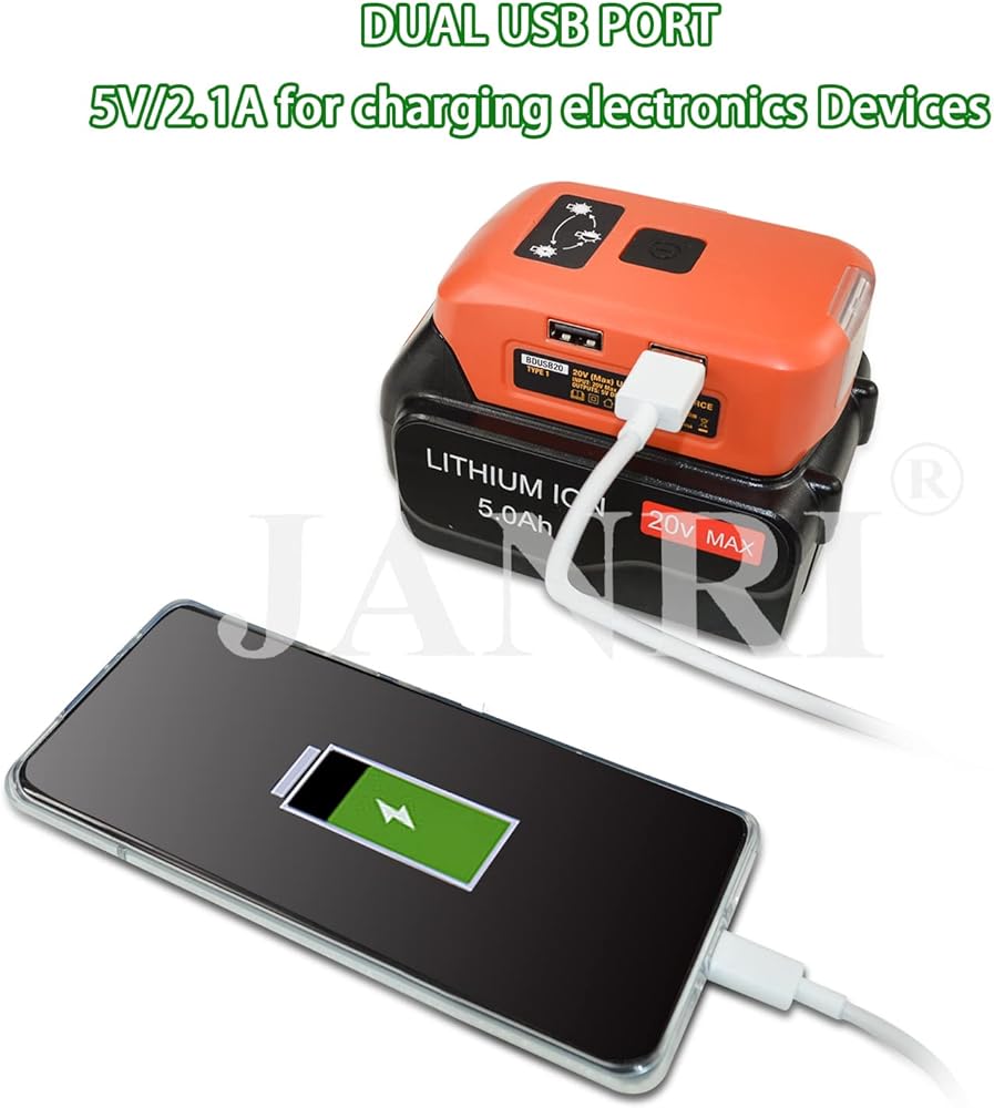 JANRI POWRE SOURCE Adapter Converter for 20V BLACK+DECKER Lithium ion LBXR20 LBX4020 LB2X4020 LBXR20-OPE LBXR2020-OPE LB2X3020-OPE LBXR20BT LBXR20CK battery , Dual USB Phone Charger , with DC Port Cordless Flashlight