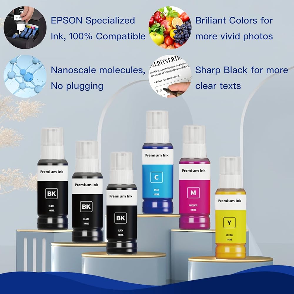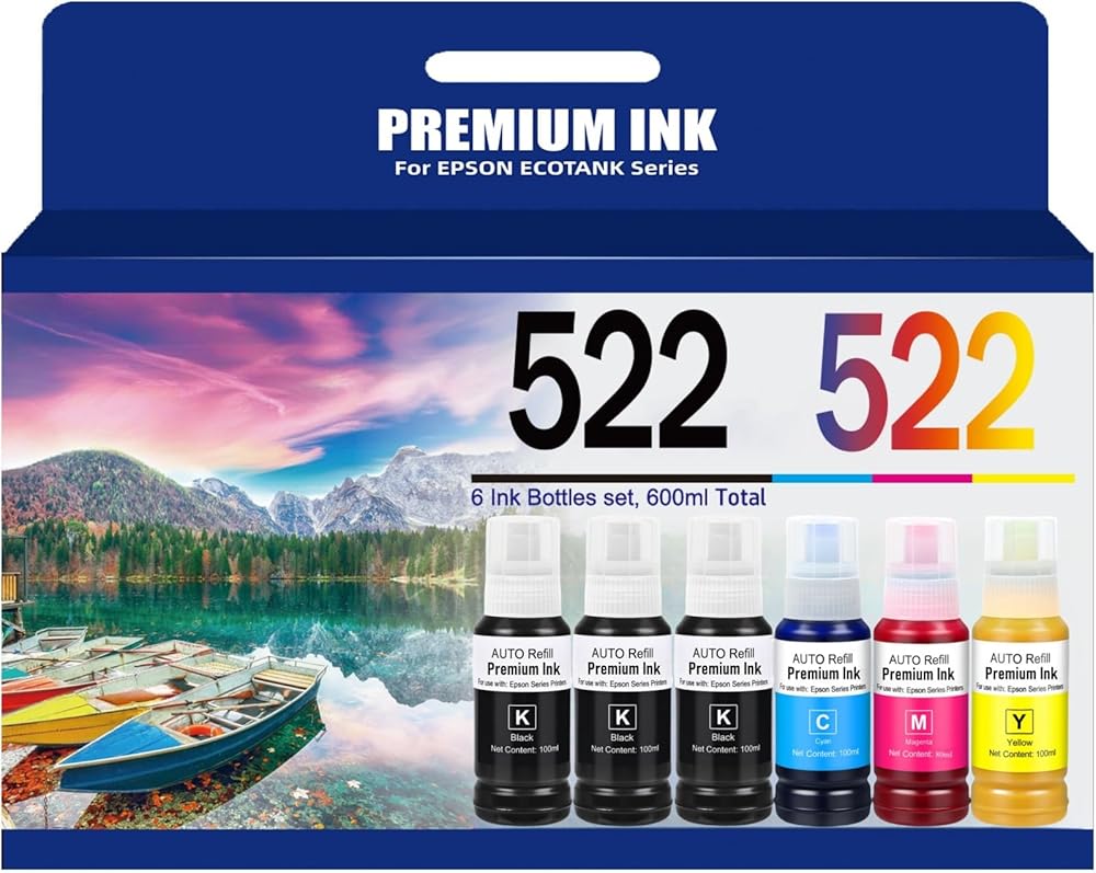 【Package Contents】: 1 x Black for Epson 522 Ink Refill Bottle 145ml, 1 x Cyan For Epson 522 Ink Reill Bottle 80ml, 1 x Magenta For Epson 522 Ink Reill Bottle 80ml, 1 x Yellow For Epson 522 Ink Reill Bottle 80ml(Total 4 Pack), use for EPSON Ecotank and Workforce series.