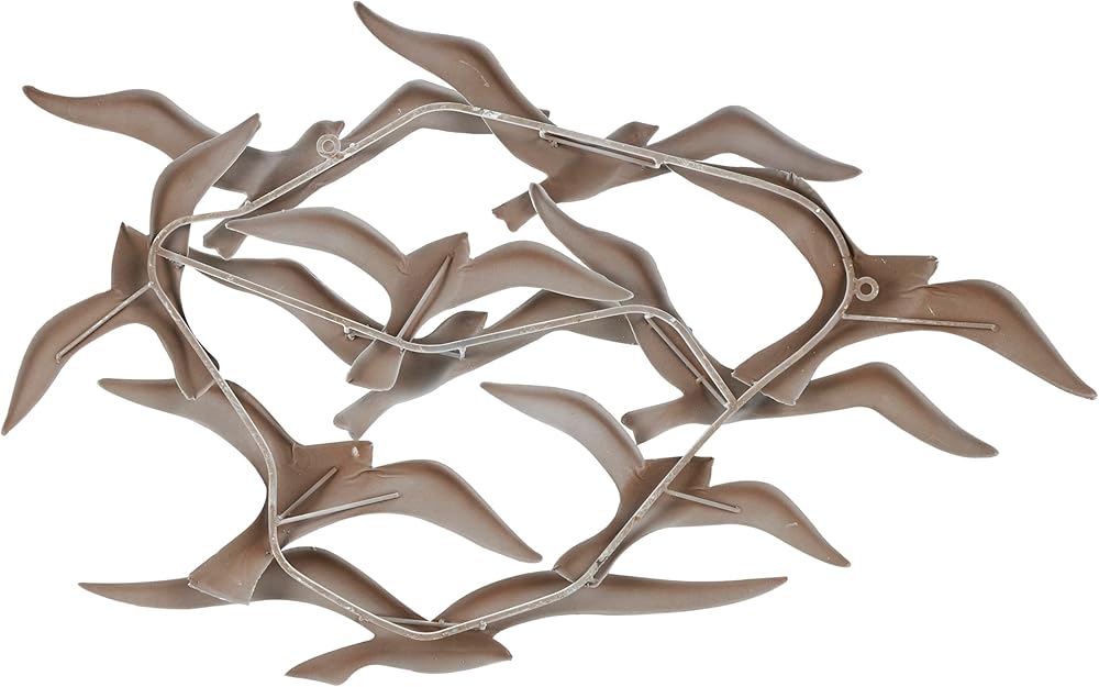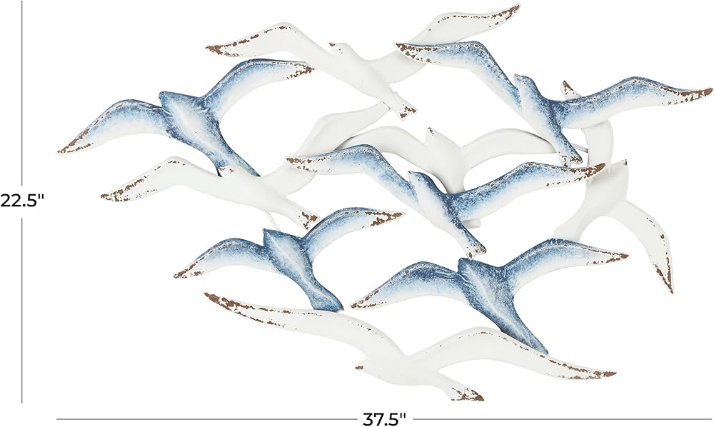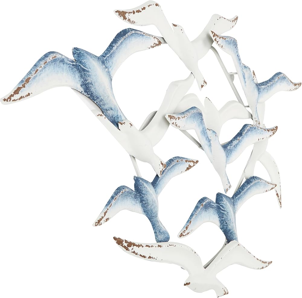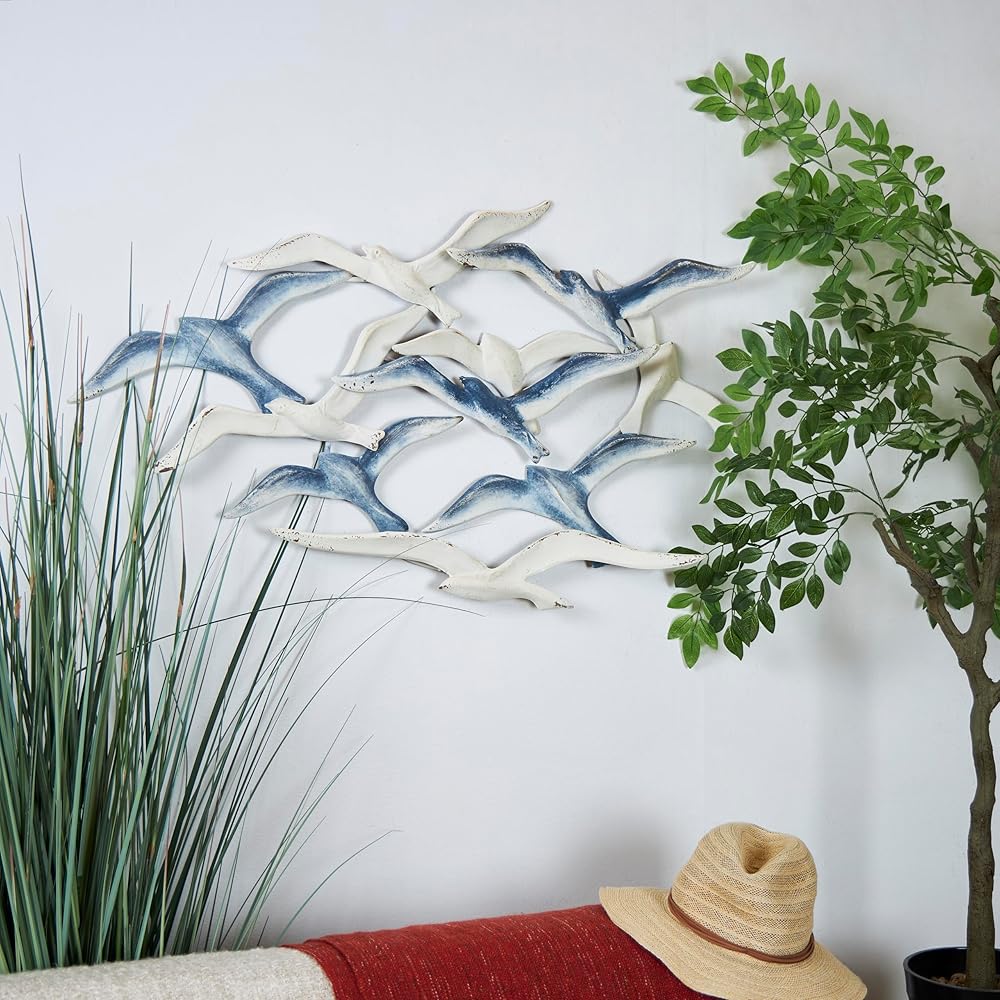 Each bird in this coastal room wall decor is meticulously crafted and welded together via their wings, creating an intricate flock flying in harmony. Distressed blue wall art for the living room highlights an asymmetrical design showcasing a flying flock of birds, adding an artistic flair to your space. Wipe clean with a dry cloth. This bird wall sculpture can serve as an eye-catching focal point in your living room, entryway, or bedroom, enhancing the aesthetic appeal of these spaces. This item ships in 1 carton. Can be hung horizontally using the hanging hooks; nails and screws not included. Suitable for indoor use only. This item ships fully assembled in one piece. This is a single blue colored wall sculptures. Natural style.