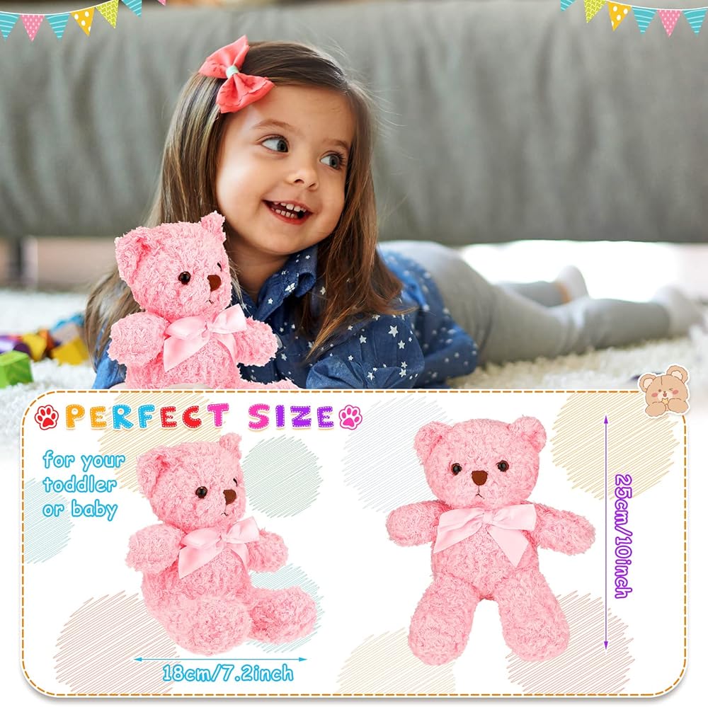 Adorable design: the size of this mini bear is 13.7 inch tall,it wears a bow on the neck, and comes in 7 vibrant colors (namely brown, white, grey, pink, purple, blue and dark brown), lovely and lively, which will be welcomed by many people