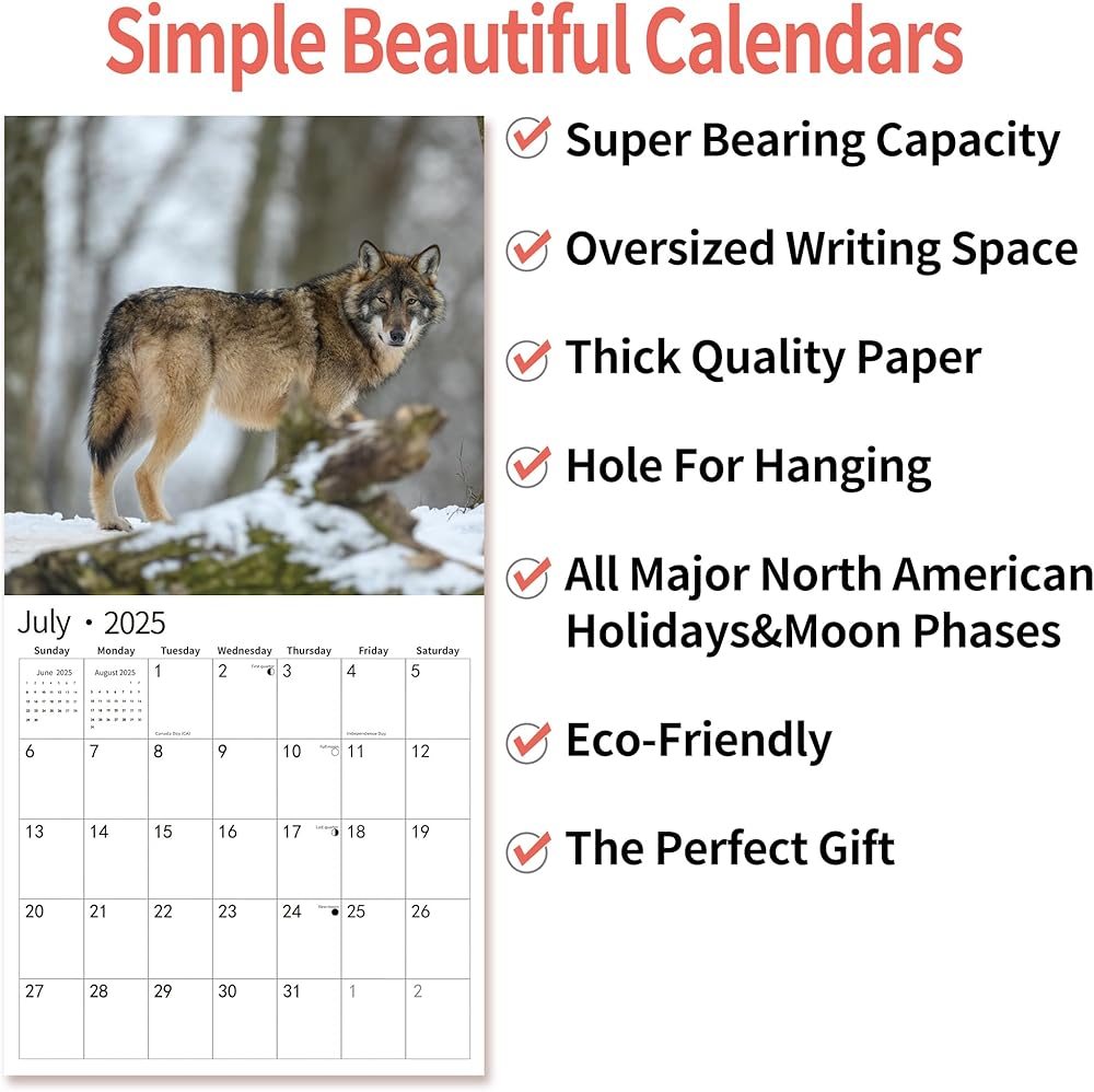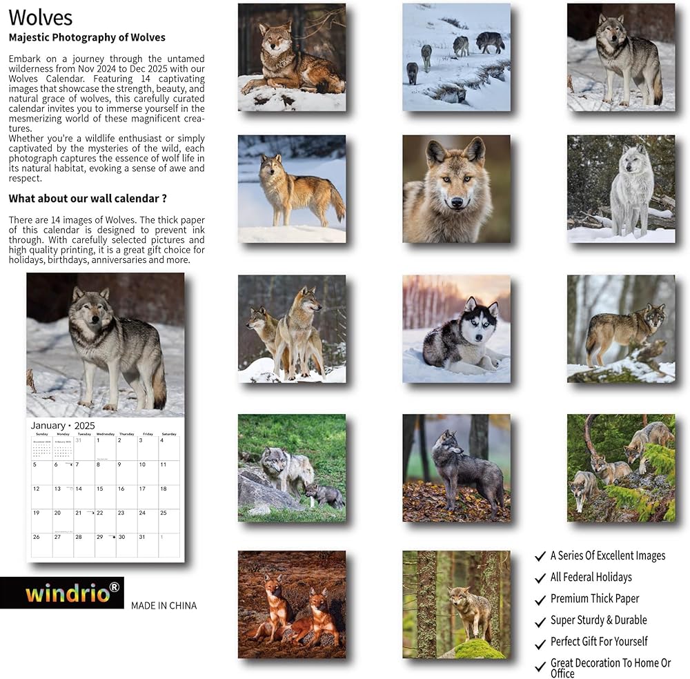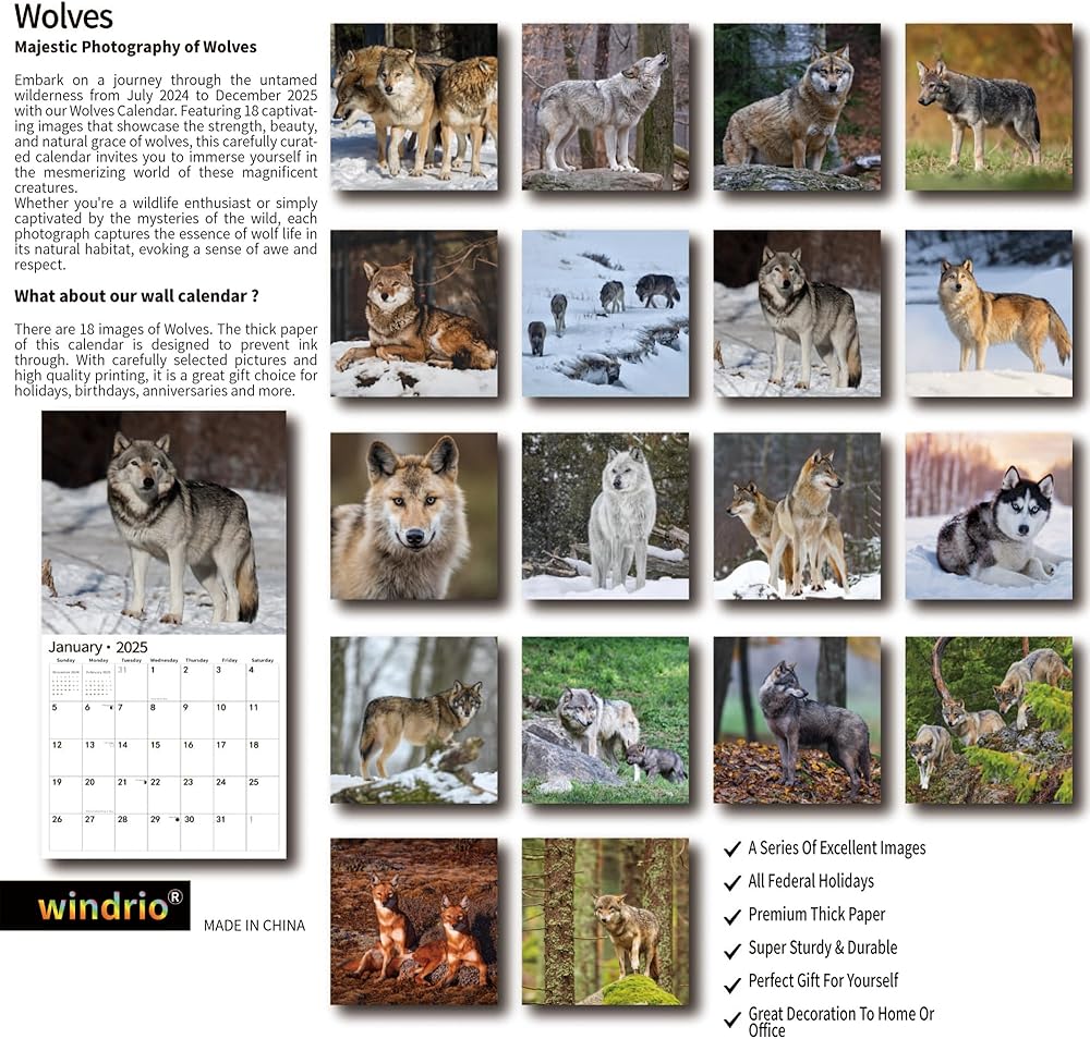 WONDERFUL PHOTOGRAPHY OF WOLVES - Featuring 18 captivating images that showcase the strength, beauty, and natural grace of wolves, this carefully curated calendar invites you to immerse yourself in the mesmerizing world of these magnificent creatures. Whether you're a wildlife enthusiast or simply captivated by the mysteries of the wild, each photograph captures the essence of wolf life in its natural habitat, evoking a sense of awe and respect.
