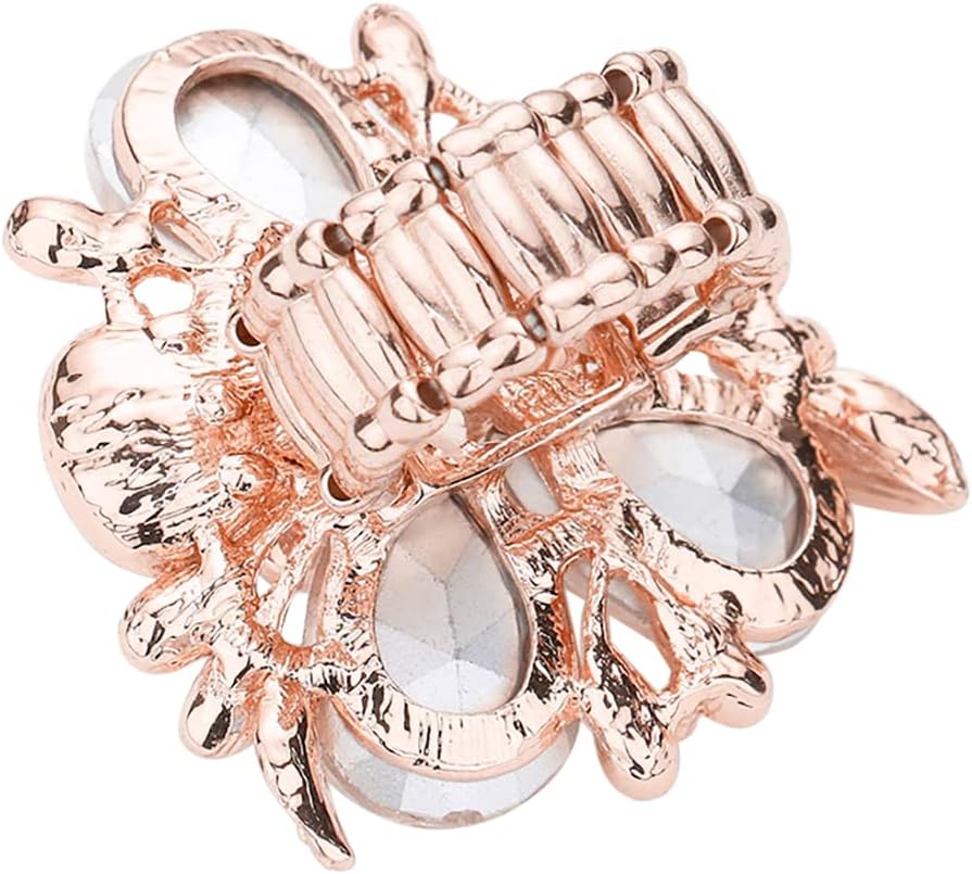 Fashionable and trendy over sized stretch band ring features large teardrop shaped crystal rhinestones, petals encrusted with round crystals and faux pearls making a stunning flower design. Stretchable ring is comfortable and easy to wear,