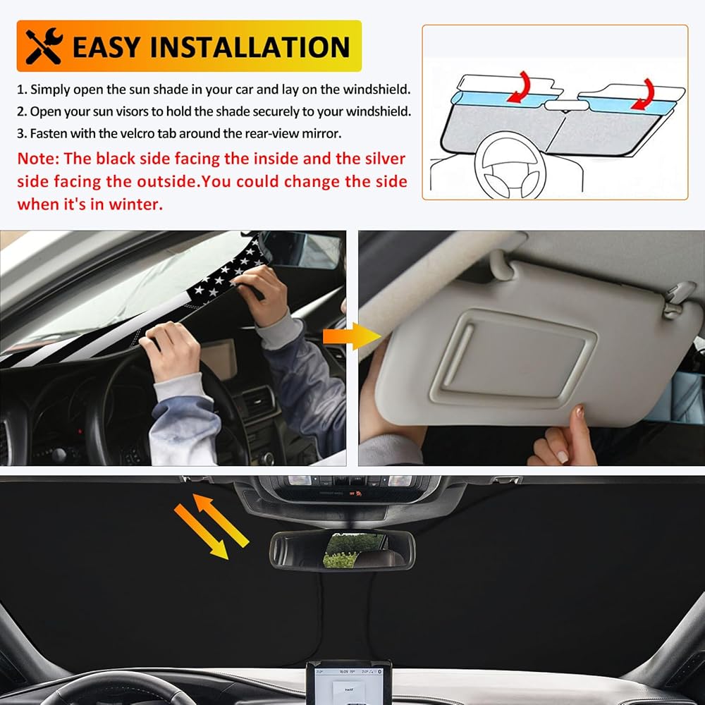Easy Installation: No tools and no modifications needed. Effectively reduce the temperature in the car on summer and can help the interior accesseries out of the high temperature. Very easy to install and store. Just open and unfold. It can be packed and store at the car due to the strong resilience, tiny size and foldability. Because of the elastic steel, you don't need to worry about the deformation problem.