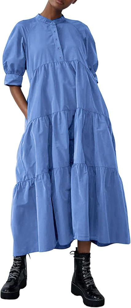 Maxi shirt dress for women featuring classic 1/2 button up placket with tiered bottom hem, and 1/2 puffy short sleeve, stand band collar, below knee length