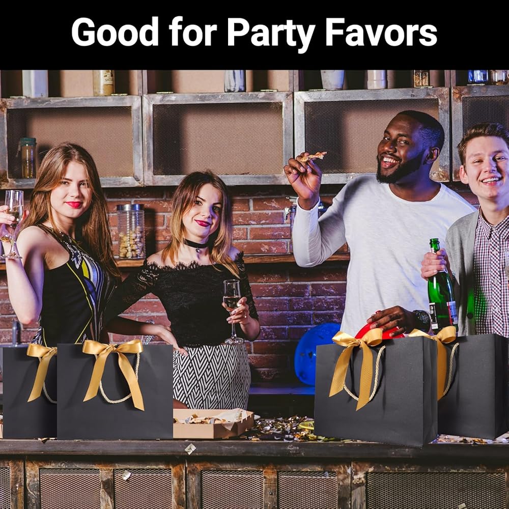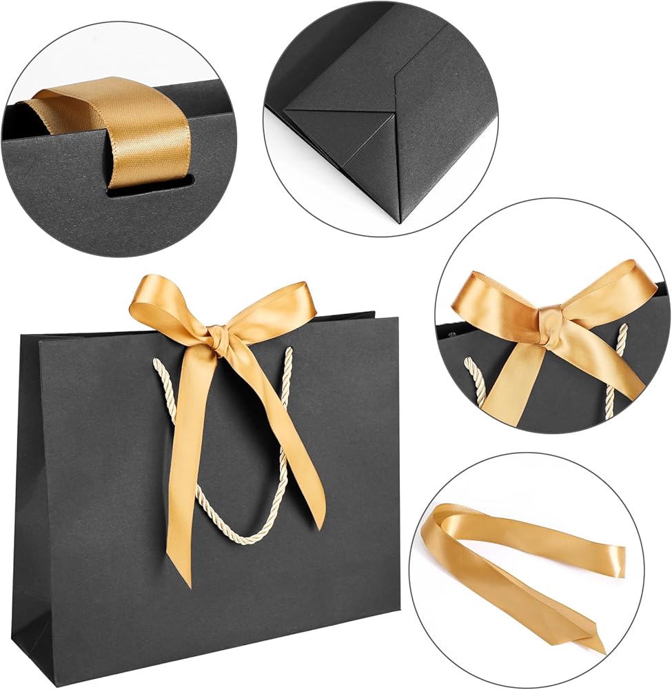 【 Quantity & Size】 Comes with 12pcs of black gift bags with handle and 12pcs ribbon(You need to assemble your own bows), measuring approx. 10.6"x3.1"x8.3", good for storing makeups, clothing, and other party favors.
