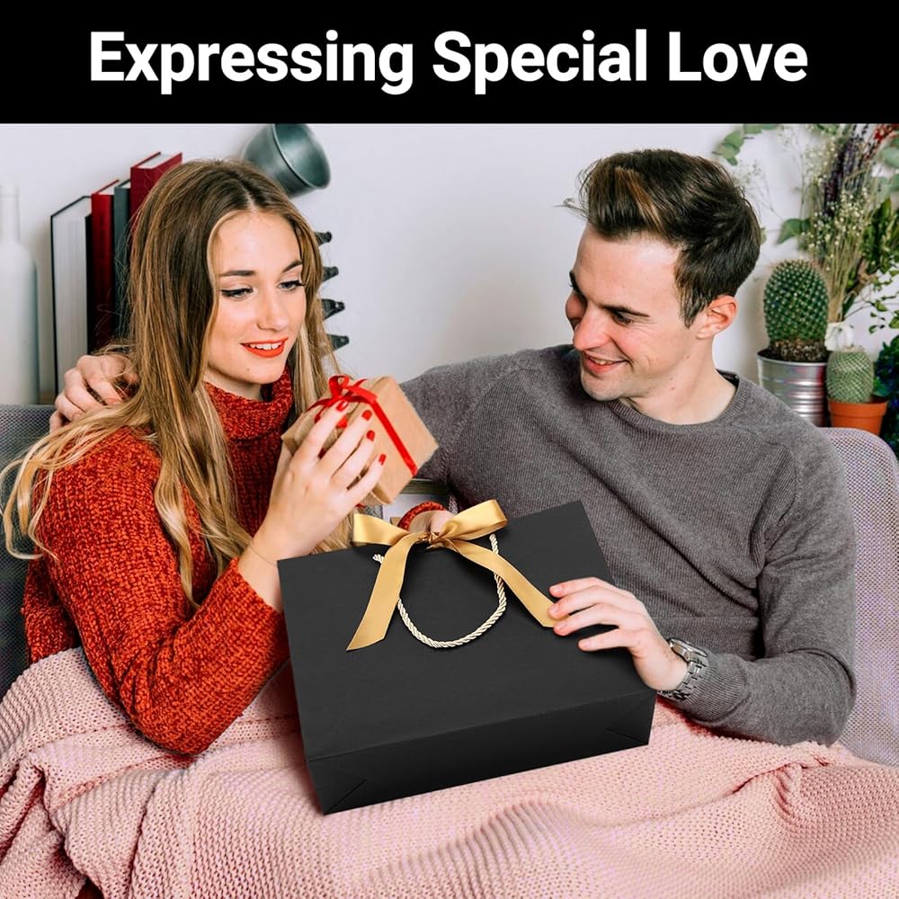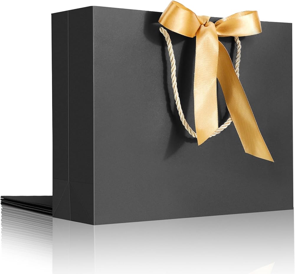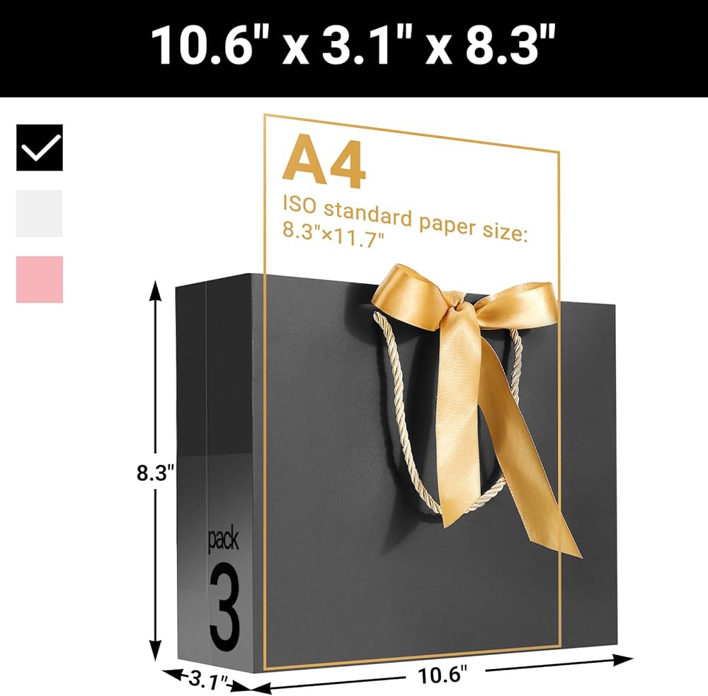 【Multiple Colors】 Choose from pink, white or black gift bags with handles and ribbon in a size of 10.6"x3.1"x8.3" to fit any gift and occasion.
