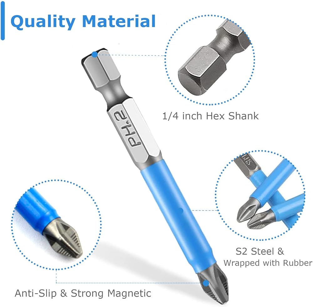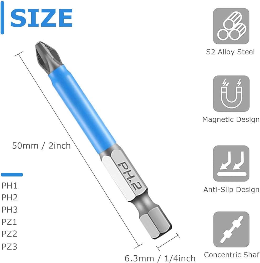مجموعة لقم مفك براغي مغناطيسية مضادة للانزلاق من الفيلسل، 12 قطعة PH1 PH2 PH3 PZ1 PZ2 PZ3 مجموعة لقم مفك عزم S2 من خليط معدني من الستيل 1/4 انش سداسية شانك متقاطعة، ملحقات مفك عزم للادوات الكهربائية (50 ملم)