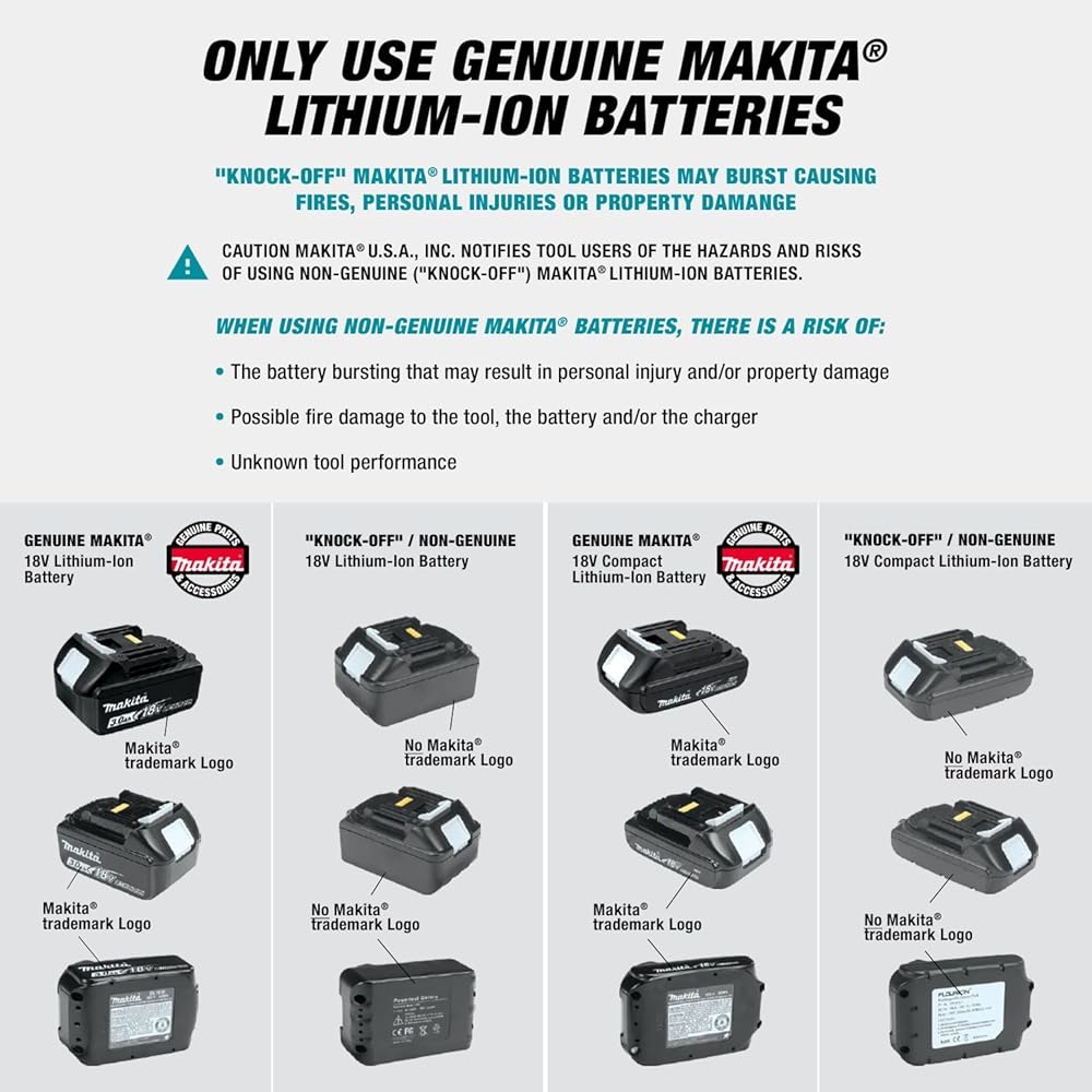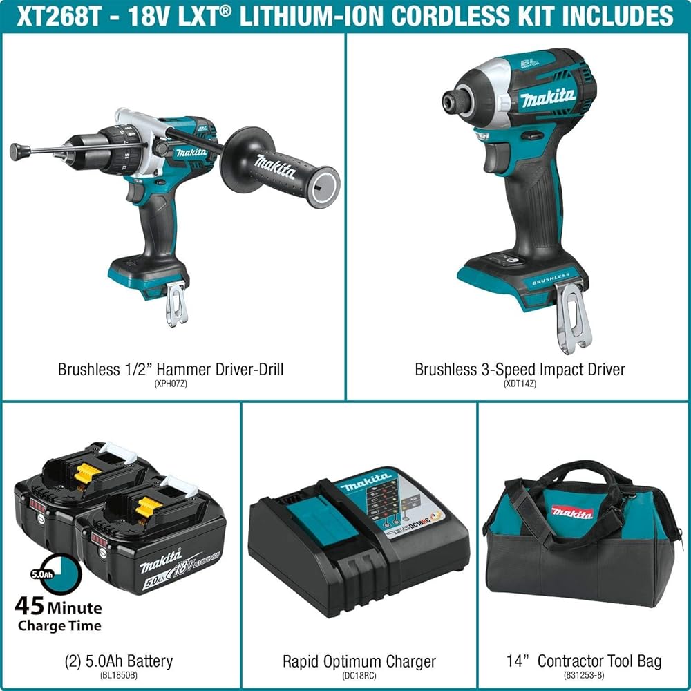 Makita is the innovation leader in brushless motor technology, and the 18V LXT Brushless 2-Piece Combo Kit (model XT268T) gives you two brushless solutions with more performance features for drilling, driving and fastening. Each tool features an efficient Makita BL Brushless Motor that is electronically controlled for longer run time, increased power and speed, and longer tool life. The combo kit includes a Hammer Driver-Drill with a full 1,090 in. lbs. of Max Torque for the most demanding applications in wood, metal and masonry. The kit also includes an efficient and compact Impact Driver that combines a full 1,550 in. lbs. of fastening torque with category-leading precision features. Quick-Shift Mode is an automatic electronic controller that downshifts and reduces rotation and impact speed prior to driving the screw into place, and is engineered to minimize screw thread stripping, breakage and damage to work. For faster tightening of self-drilling screws, the Tightening Mode (T-mode) is engineered to prevent damage to the screw or work piece. These precision features, combined with 3-speed power settings, give users an impact driver with more control for a wide range of fastening tasks – from cabinet screws and deck screws to lag bolts, and much more. The 18V LXT Lithium-Ion 5.0Ah batteries have the fastest charge times in their category, and for increased convenience they include an on-board L.E.D. charge level indicator.