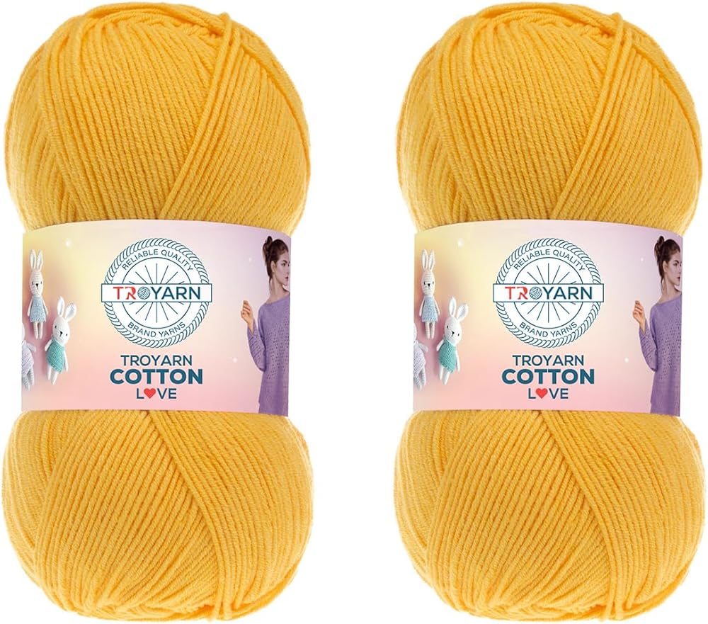 Troyarn Cotton Love yarn is made of 55% Cotton 45% Acrylic Yarn.Needle size US 4 - 8 or 3.5 - 5mm Hook size 2mm - 4mm (G).One Ball Weight: 3.52 (100g) ; Length: 360 yds (330m) and Tickness : Fine/Sport 2 Weight.Hand Washable at 30C or 86F, Dry Flat and clean, Do not Bleach, Do not Iron.Troyan Cotton Love suits well for creating All season clothes and accessories: dresses, blouses, skirts, bags, etc. Blankets, tablecloths, napkins made from Troyan Cotton Love yarn are also very beautiful. This cotton yarn is also very popular among knitting masters who create handmade knitted toys - amigurumi.
