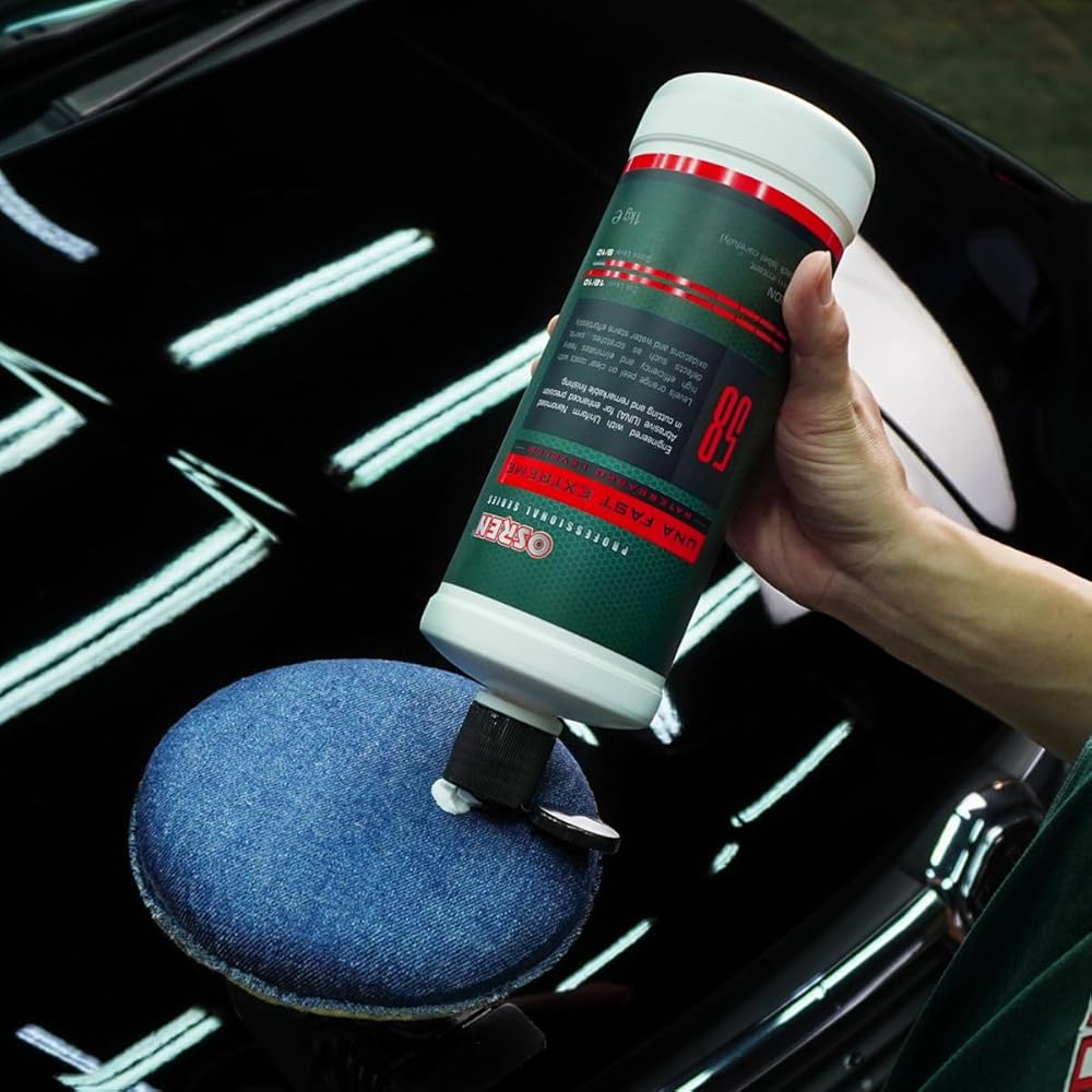 OSREN's UNA FAST Extreme 58 is a unique abrasive formulated to efficiently remove orange peel, sanding marks and other heavy defects on paintwork to produce a mirror-like shine on the paintwork surface. Formulated to remove orange peel and other tough defects independently. Its cutting capabilities originates from the uniform nanomised abrasive (UNA) that primes the paintwork surface to be treated for an easy defect removal solely at micron level. Recommended to be paired with either a Denim Levelling Foam or Velvet Levelling Foam with a dual-action polisher or rotary polisher on low-speed. Compatible on all types of paintwork and any scratch - resistant clear-coat.