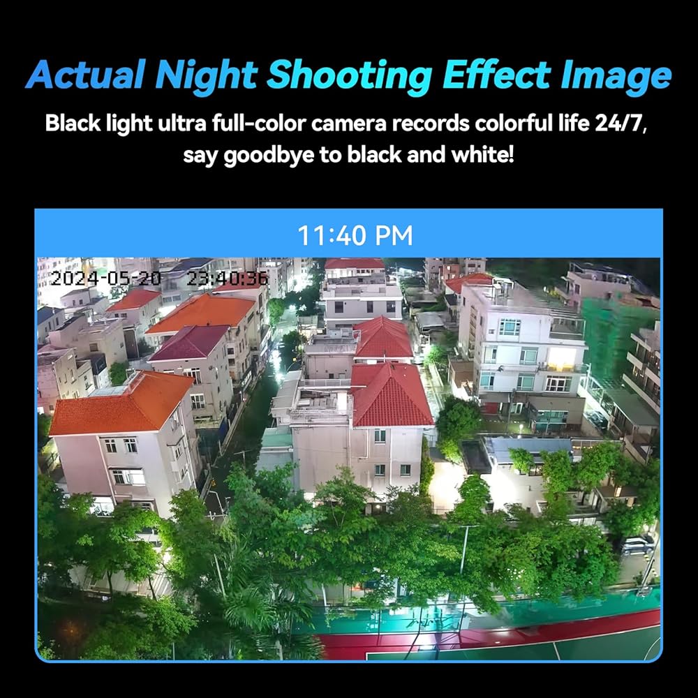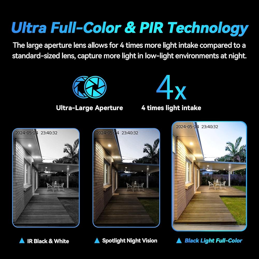 【Black Light Technology 】ACEMO wireless security cameras have a black light feature that provides full-color surveillance images all day. The black light night vision offers advanced technology for low-light environments, ensuring clear & color monitoring images and enhanced detail capture. It addresses issues with traditional cameras losing color in infrared light and the difficulty of starlight cameras due to insufficient ambient light at night. This feature significantly improves night surveillance clarity and protection levels.