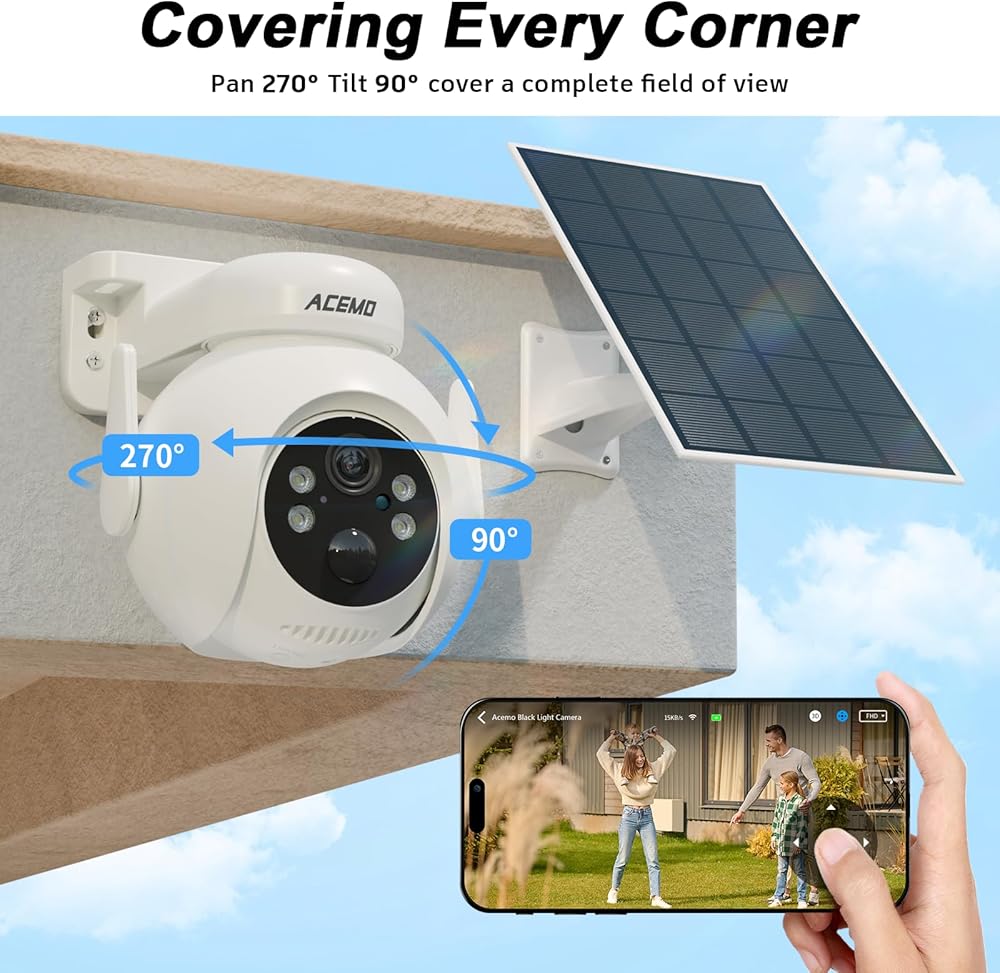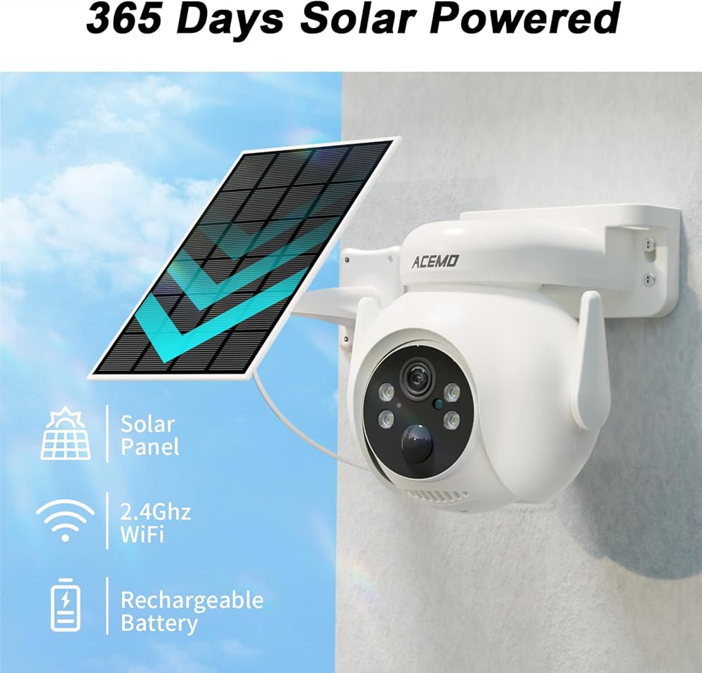ACEMO 2K Solar Camera Outdoor Wireless, Security Cameras Battery Powered, Full Color Night Vision, PTZ Surveillance WiFi Camera Outside, Human Detection, IP66 Waterproof, 2-Way Talk, 7/24 Record