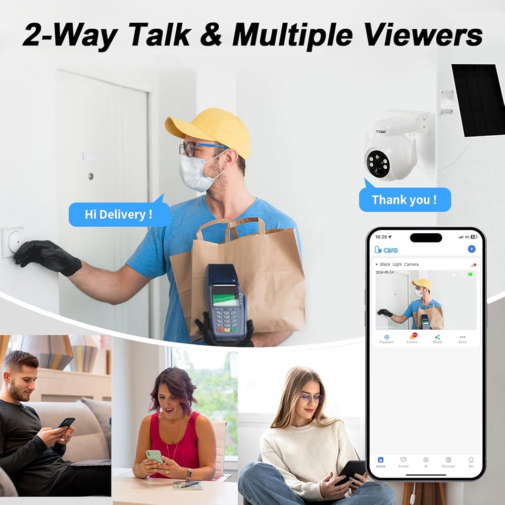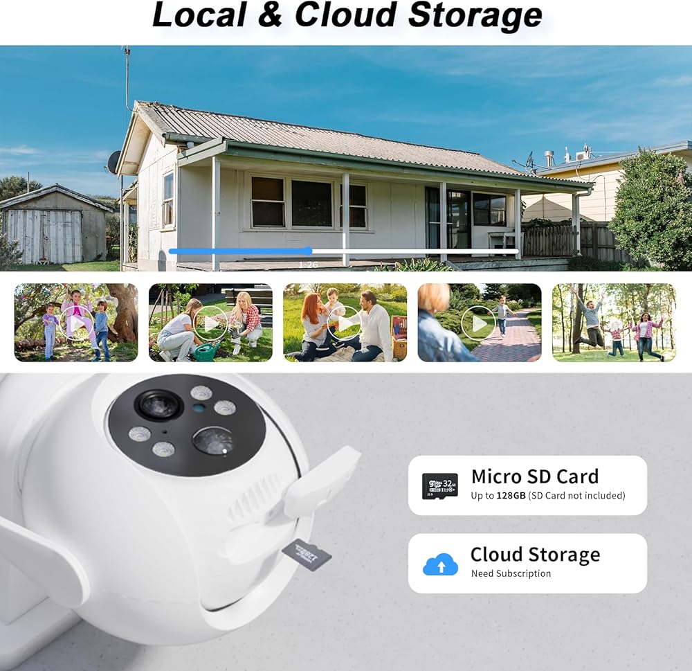 【More Function】Our outdoor wireless camera supports two-way talk and share with multiple users, allows you to share the device with your family and friends for simultaneous monitoring through our user-friendly app. This solar security camera provides two storage options, including cloud storage option and support for up to 128GB micro SD card storage.(SD card not include). If there are any defects in this product, please feel free to contact us, we will provide you with a suitable solution within 24 hours.