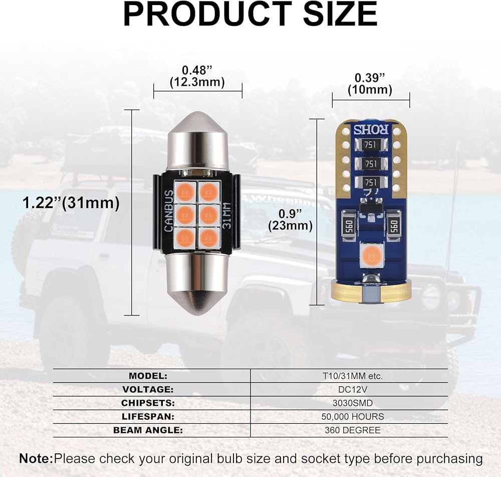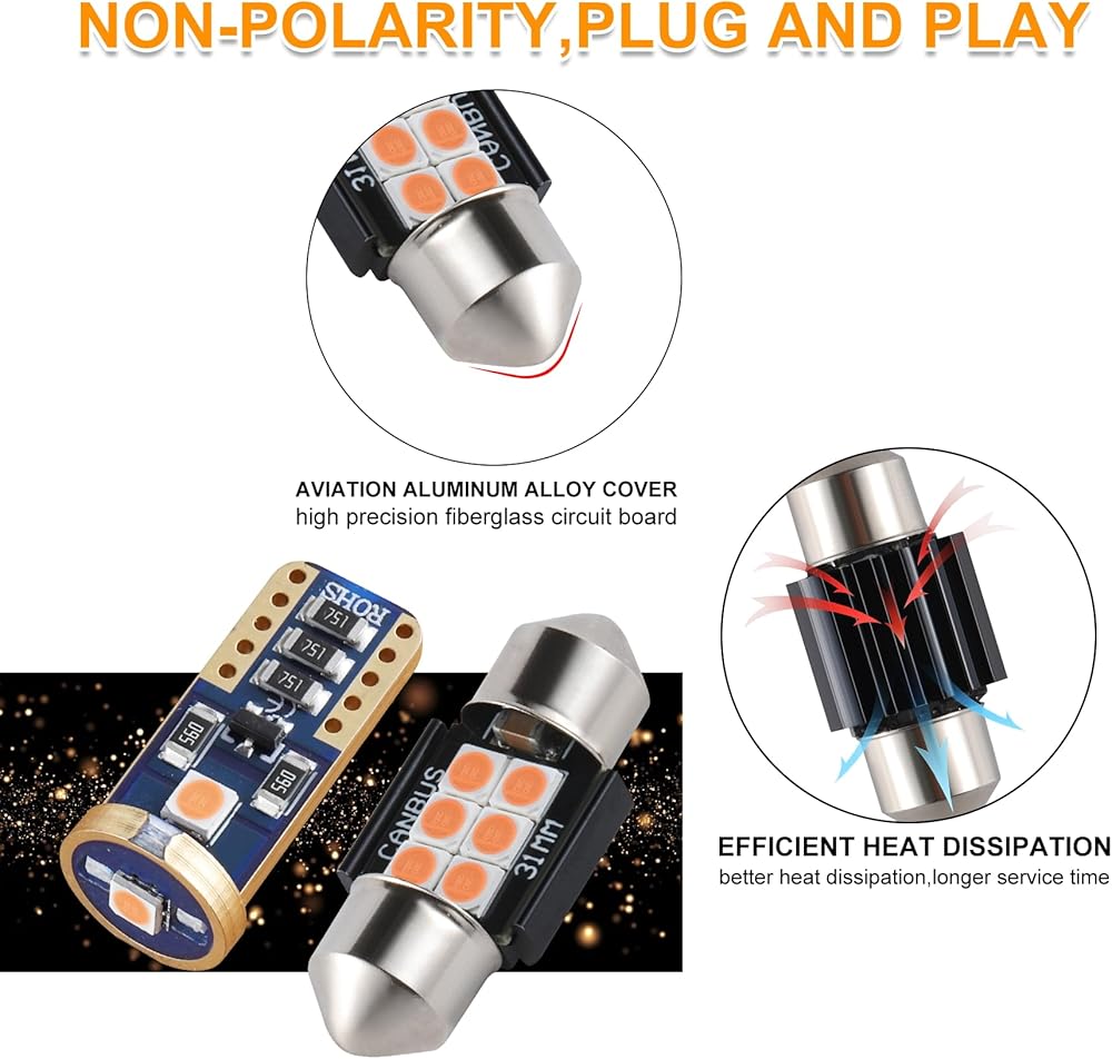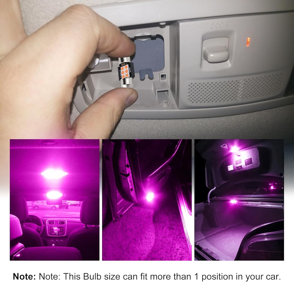 Application: License plate Lights, Side Door Courtesy Lights, Interior Map Lights, Vanity Mirror Lights, Dome Lights, Parking Lights, City Lights, Cargo Lights, Corner Lights, Trunk lights etc. This Bulb size can fit more than 1 position in your car.