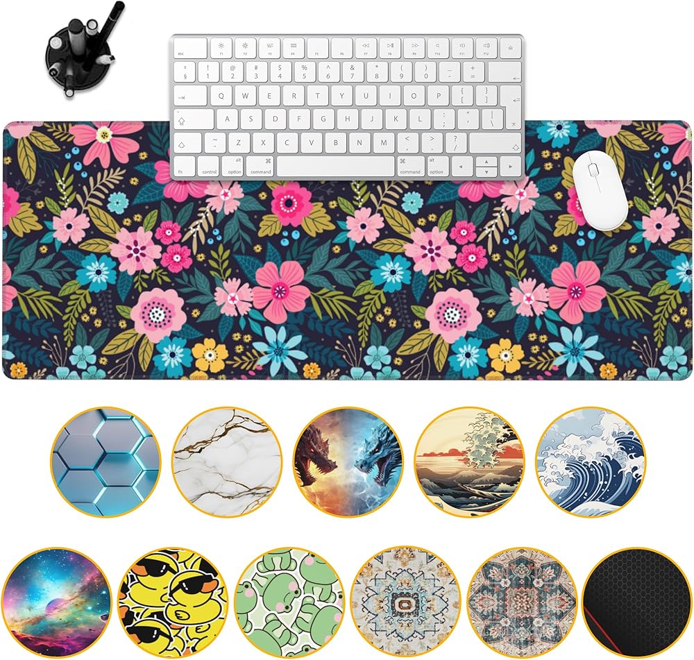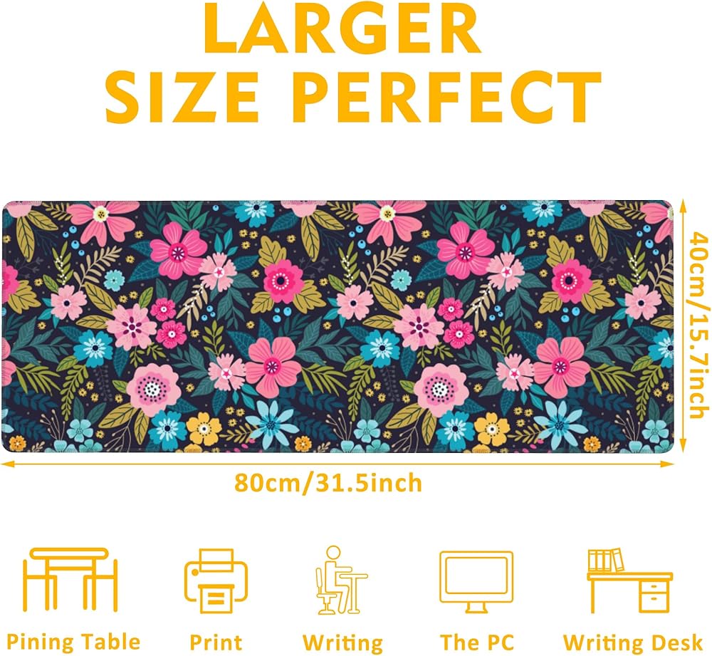 Beautiful Flowers Desk Pad, Colorful Modern Floral Gaming Mouse Pad Mat, 31.5"X15.7" Extended Gaming Mouse Pad with Stitched Edge Non-Slip Base for Office, Keyboard, Laptop