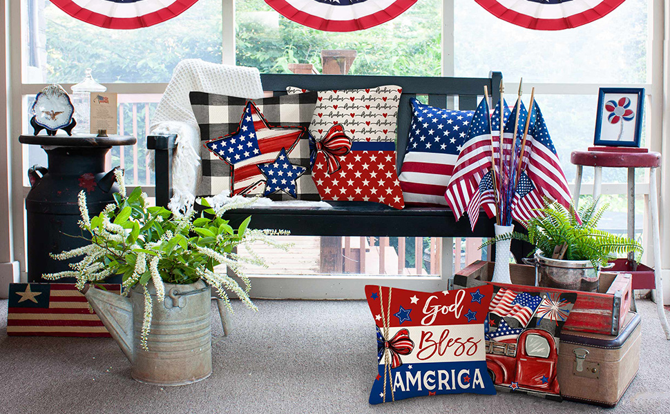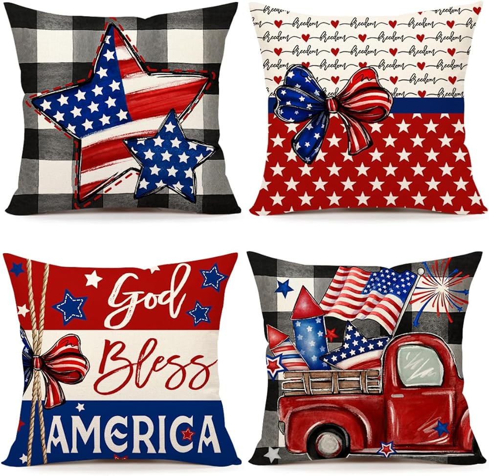أغطية وسائد الرابع من يوليو مقاس 45.72 × 45.72 سم مجموعة من 4 قطع، نجوم وطنية، الله يبارك أمريكا، الصيف، المزرعة، عيد الاستقلال، يوم الذكرى التذكاري، غطاء وسادة لتزيين المنزل والأريكة TH201