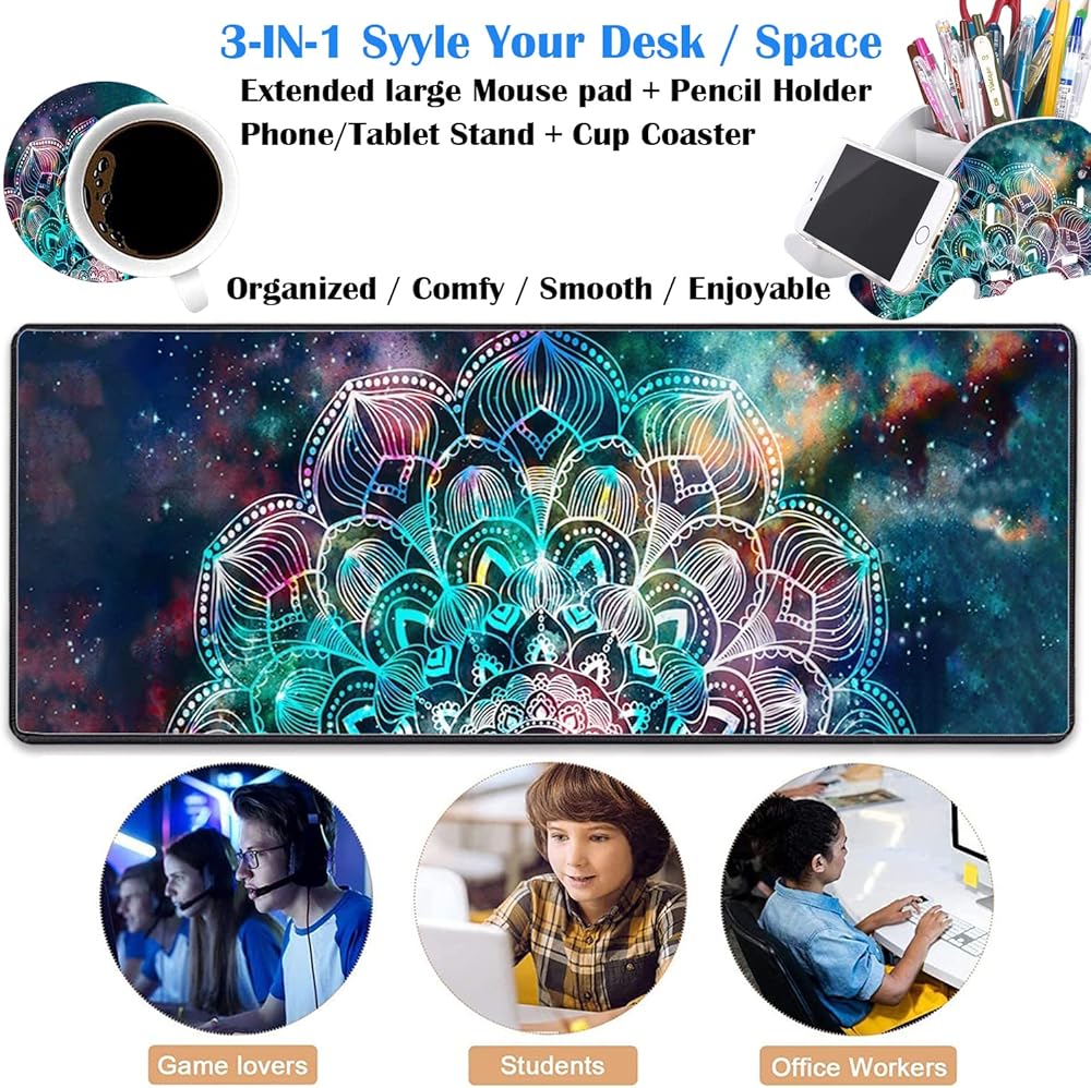 3 piece tabletop set, cushioned in quality durable fabric, unique patterned print design, fine stitched edges, pictographic pen holder and cute coasters. Suitable for office workers, game lovers and students, it is also a perfect gift.