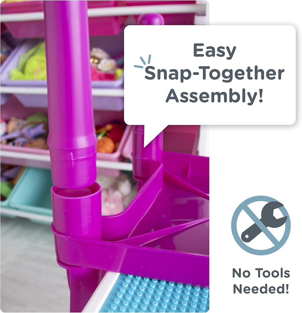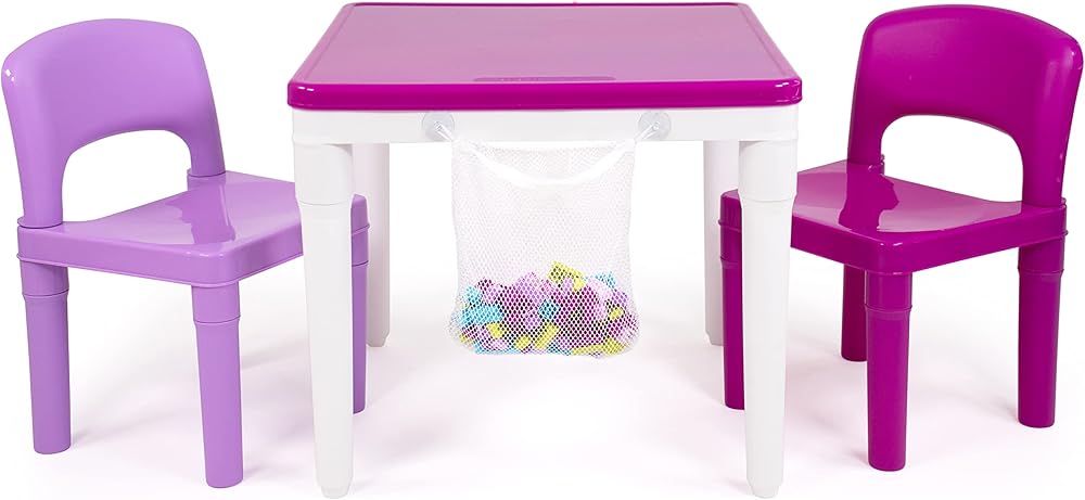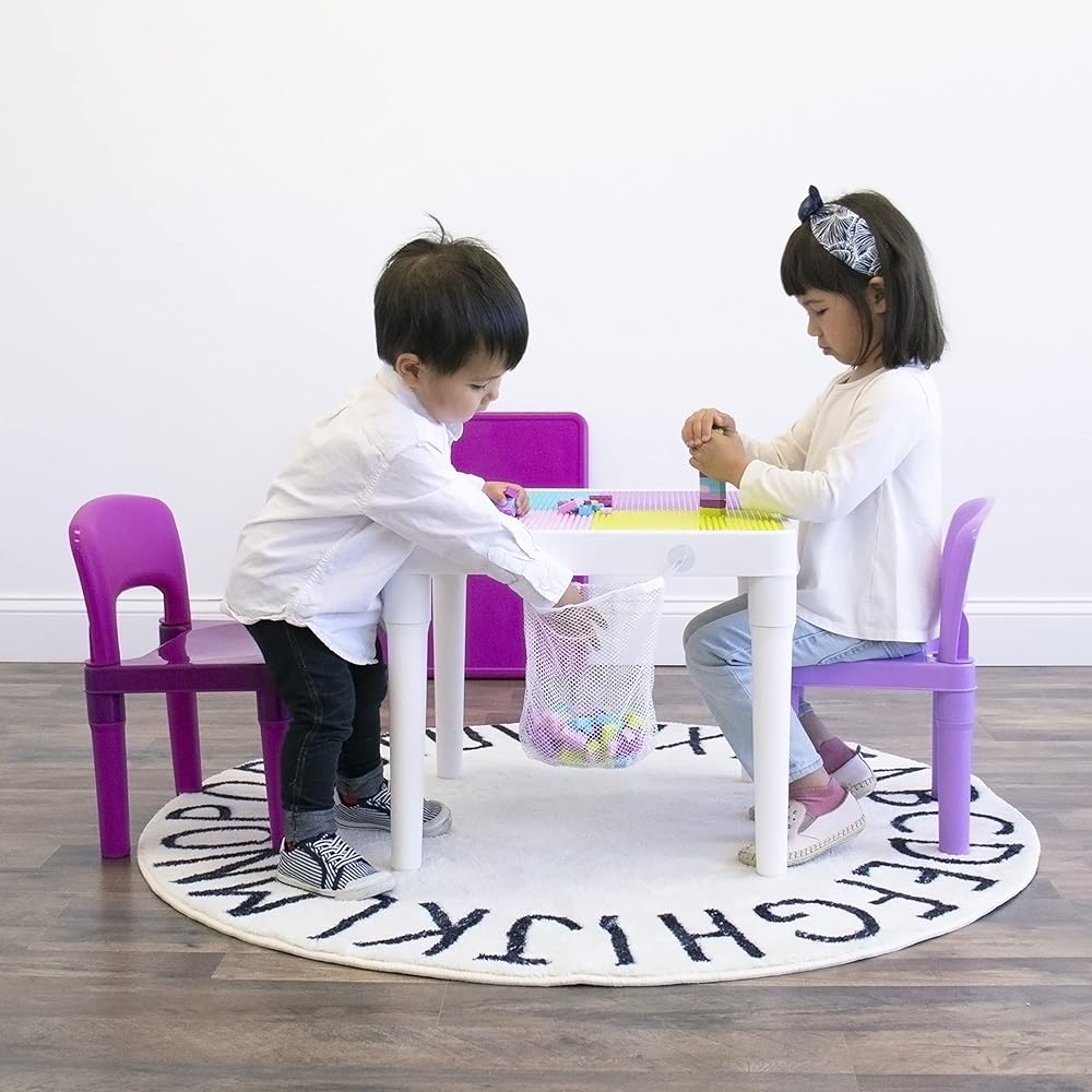 Encourage creativity and imagination with the Humble Crew Kids 2-in-1 Plastic Square Activity Table and 2 Chair Set. This versatile toddler table features a smooth removable table cover, allowing you to transform from a flat tabletop to the ultimate construction surface in just moments. Use the flat table cover for snack time, coloring, arts and crafts, slime, board games and whatever else your little one can dream up. Then, remove the tabletop cover to reveal a construction table play surface compatible for use with most plastic building blocks. An attachable mesh storage bag and 100-piece set of brightly colored plastic building blocks are also included for immediate play and simple clean-up. Durable yet lightweight, this multifunctional plastic table and chair set comes in a fun and bright color palette perfect for little girls and boys. This square table set includes 2 chairs and is perfectly sized for children ages 3 and up. It is easy to assemble with snap-together components; no hardware required! Product Sizing— Assembled table dimensions: 20"W x 20"D x 17"H. Assembled chair dimensions: 12"W x 11"D x 18"H Chair seat height: 10"