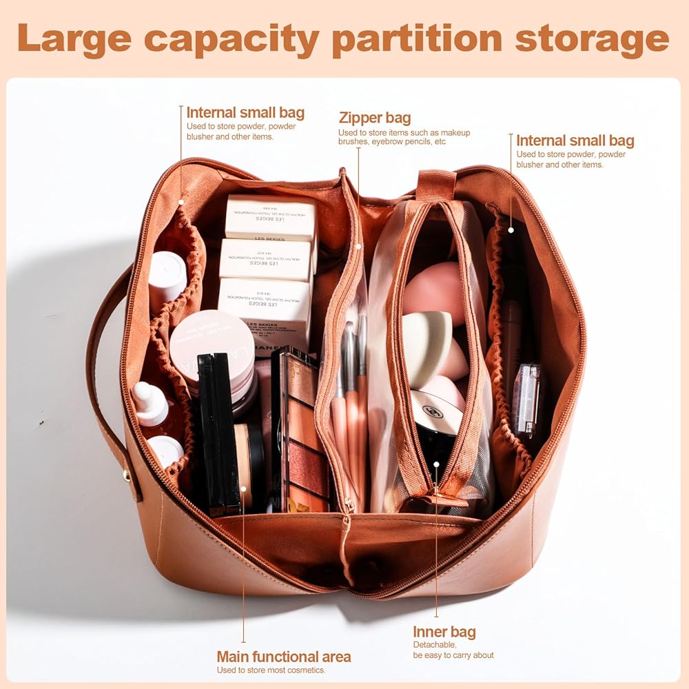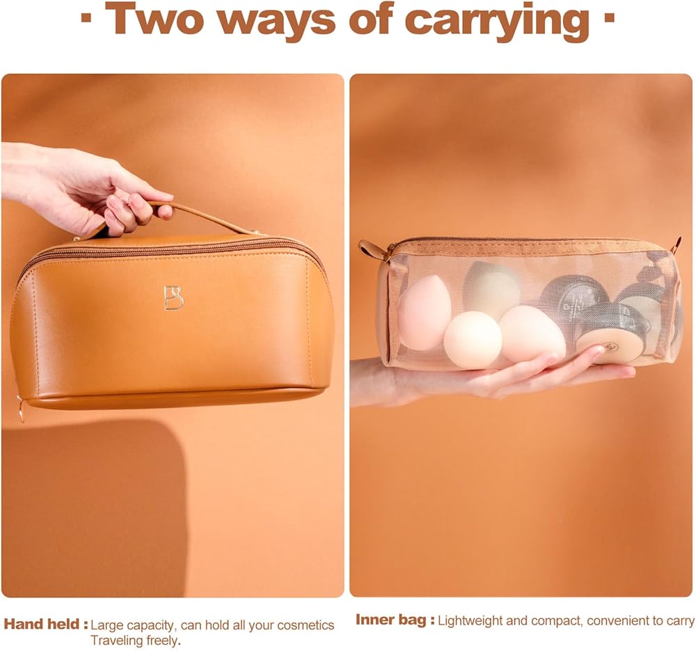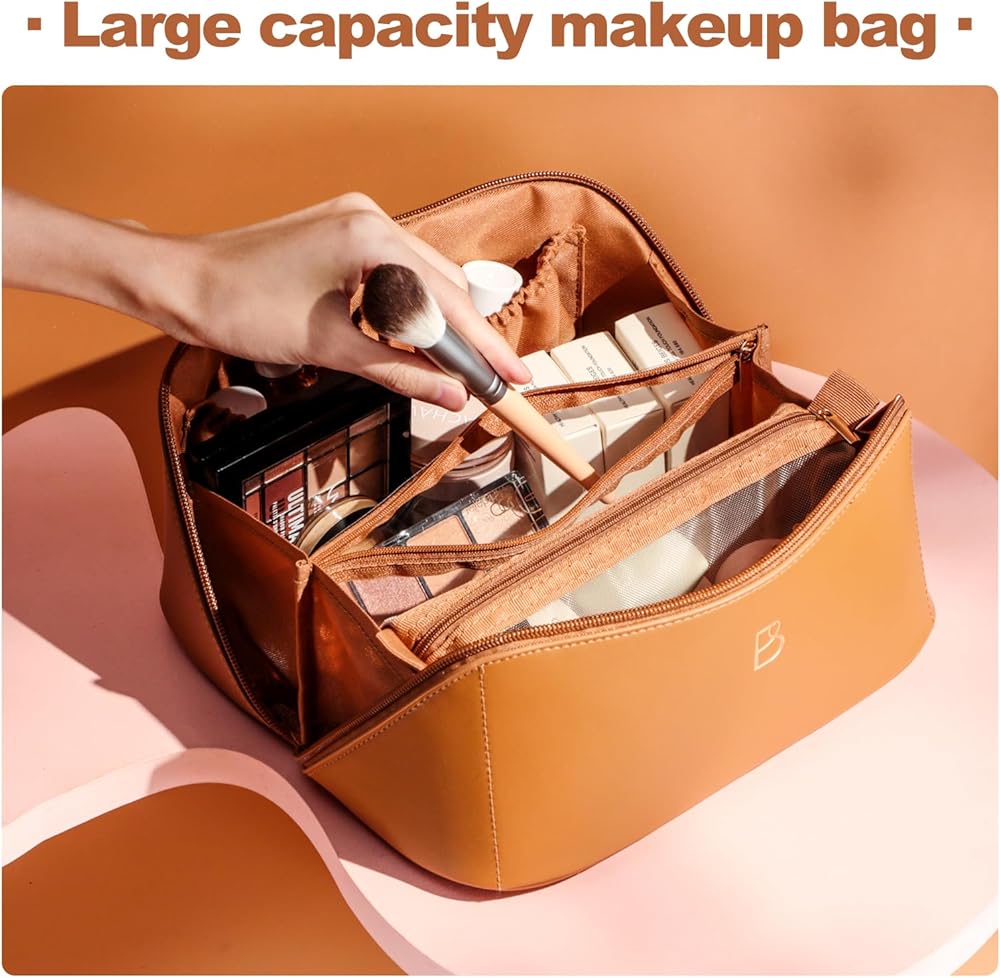 BS-MALL Travel Makeup Bag – Portable Large Capacity Toiletry Bag Perfect for Organizing Travel Size Toiletries, Flat Opening for Easy Access with 1 Makeup Brush & Zipper Bag