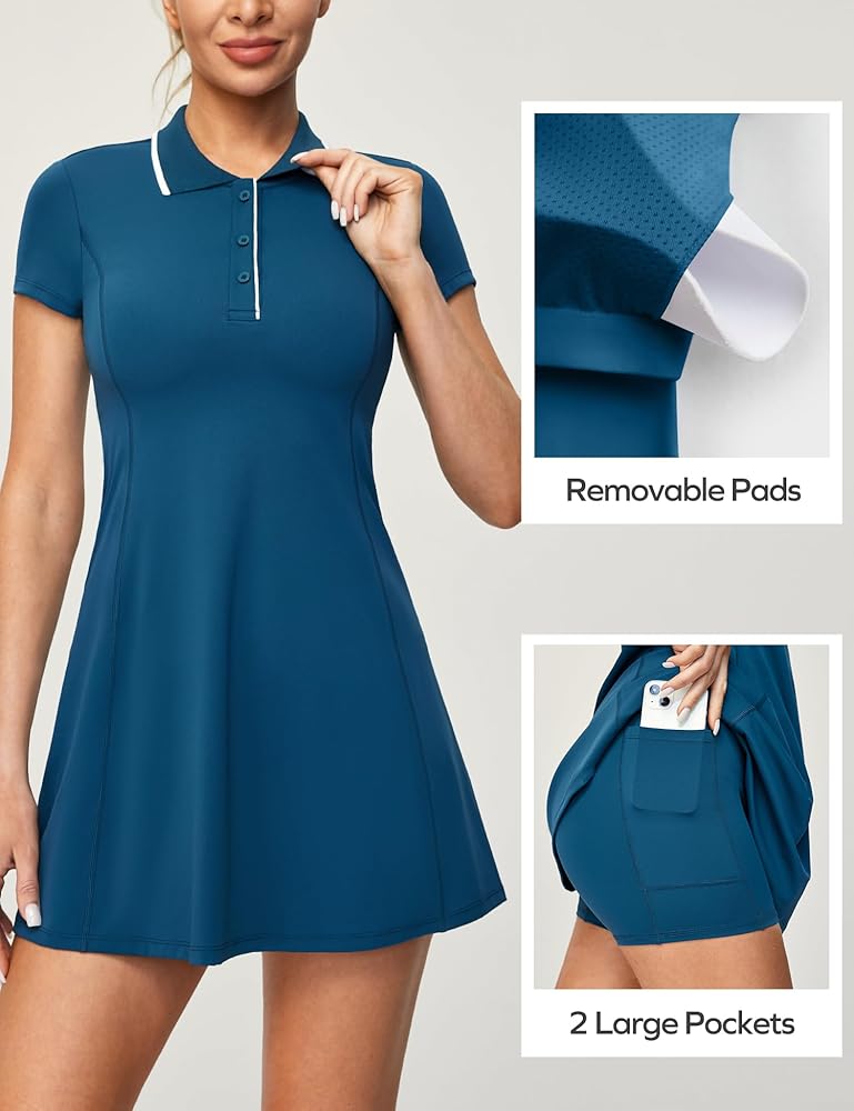 Built in Bra Dress. This so-cute Ewedoos golf outfits for women features a buttery-soft fabrication with 4-way stretch that's breathable and quick-drying, and a power-mesh lined Shelf Bra Interior for additional support and coverage without the need for layering. Up for a workout or down to chill, these tennis dresses are ready for whatever you are.
