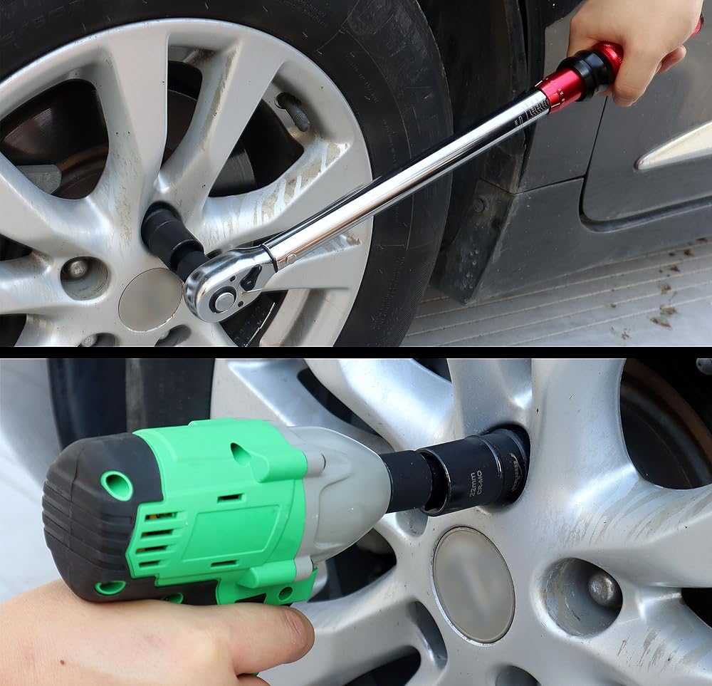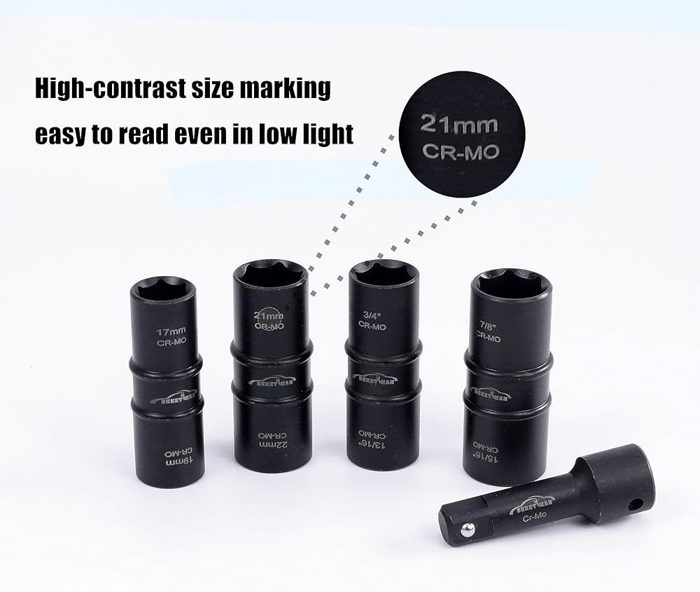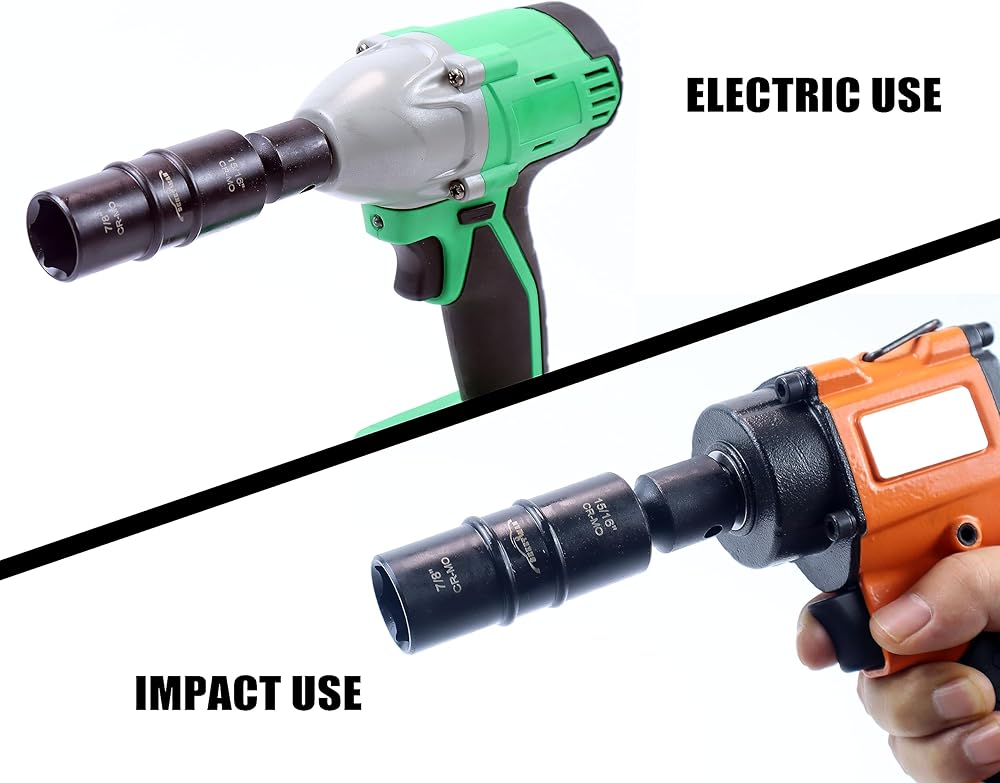 - 【Package Include】:1/2-inch Drive impact lug nut flip socket set : 17-19mm,21-22mm, 3/4-13/16 , 7/8-15/16 ,1/2" 3inches extension bar.