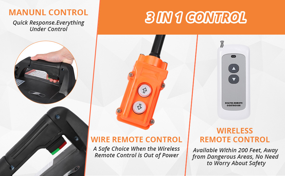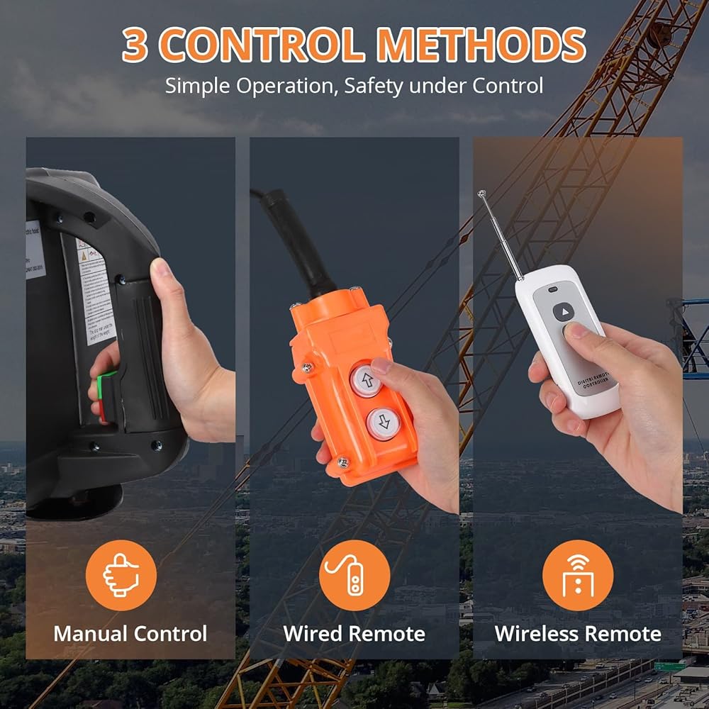 ➤【3 Control Methods】GARVEE 3-in-1 Electric Hoist can not only be controlled manually, but also with wired remote control or wireless remote control (within 200ft range), making it suitable for various lifting work occasions.