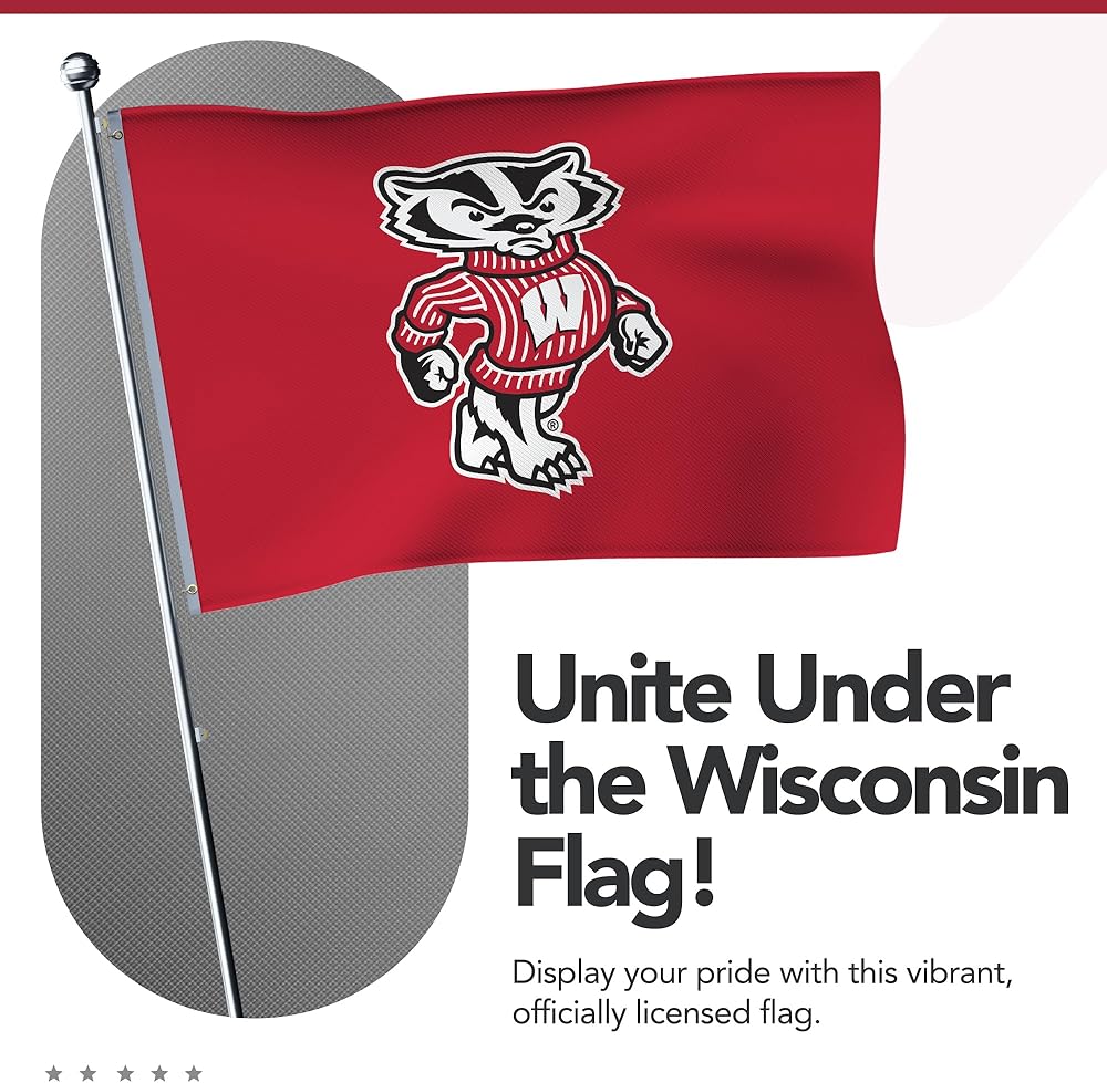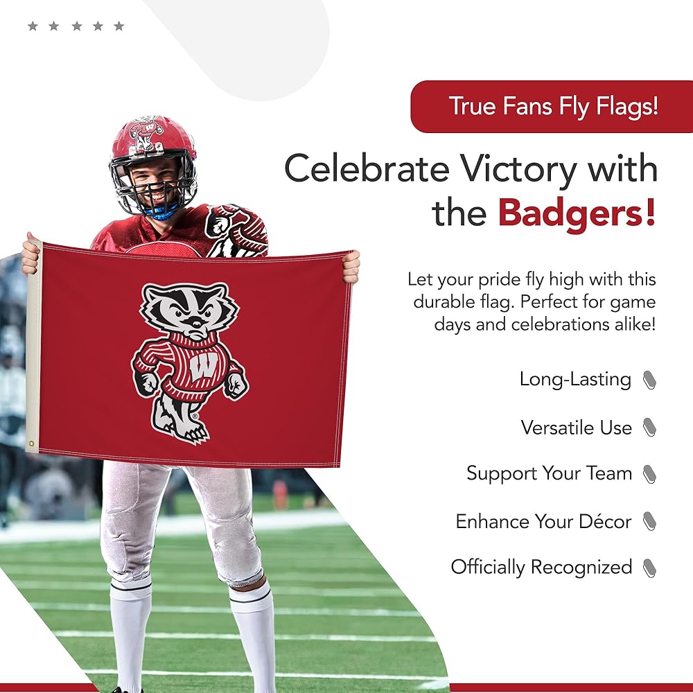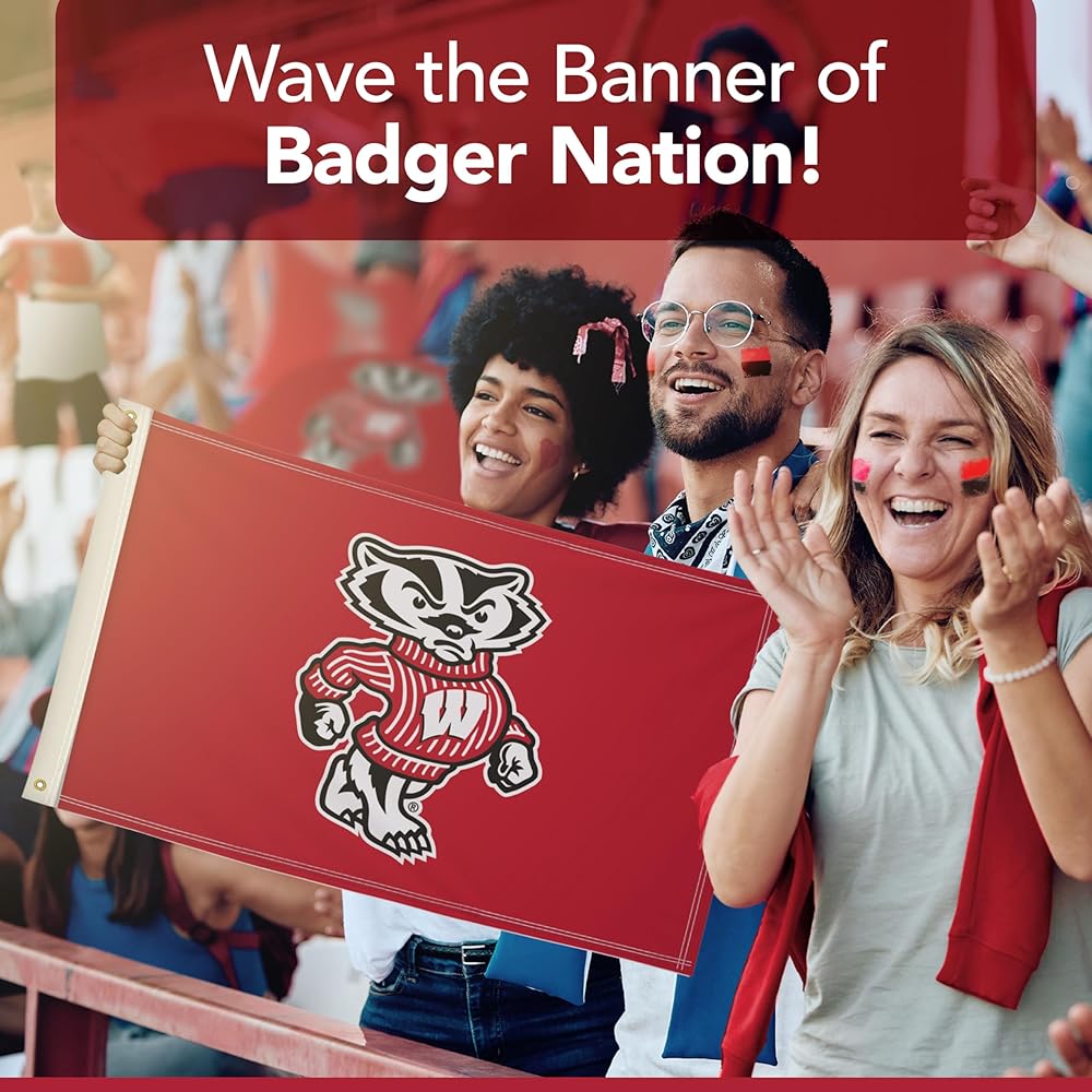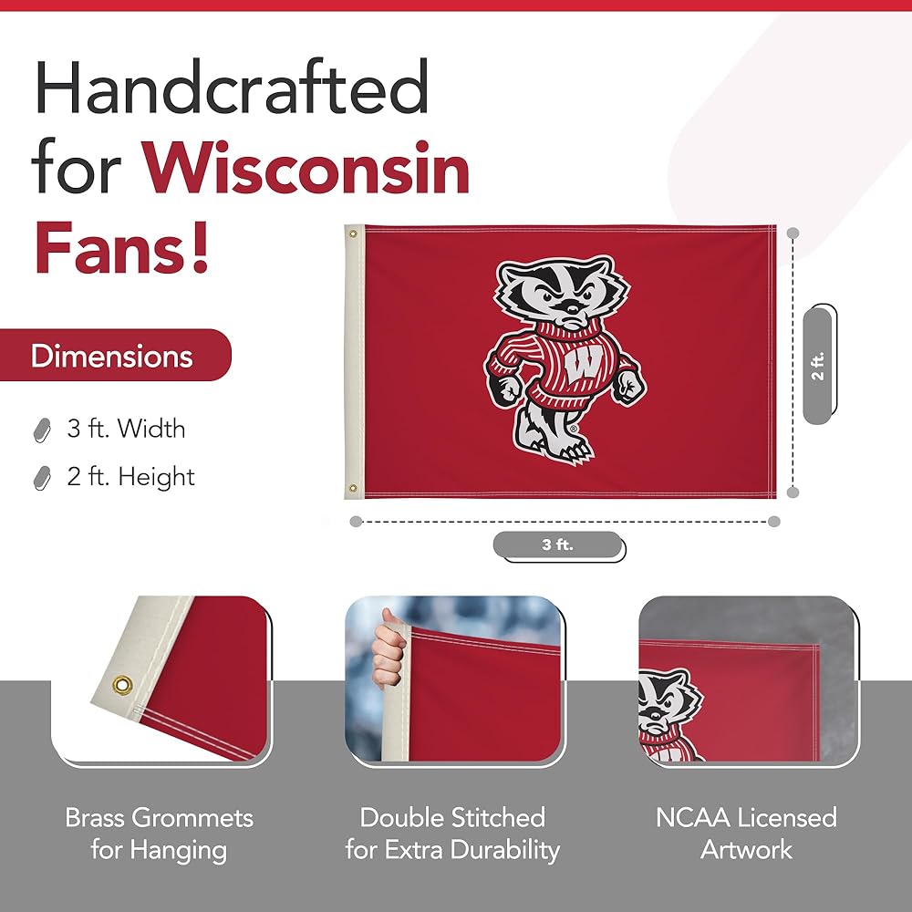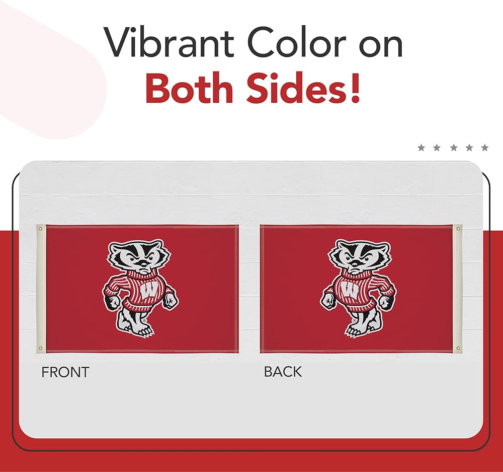 Proudly display your Wisconsin Badgers pride with this vibrant 2' x 3' Printed Flag from Victory Corps. The full-color, dye-sublimated print ensures the NCAA licensed artwork retains its vivid hues, even after extended outdoor exposure. The canvas heading and brass grommets provide a sturdy, long-lasting design that withstands the elements, making it an ideal outdoor flag for game days or everyday display.