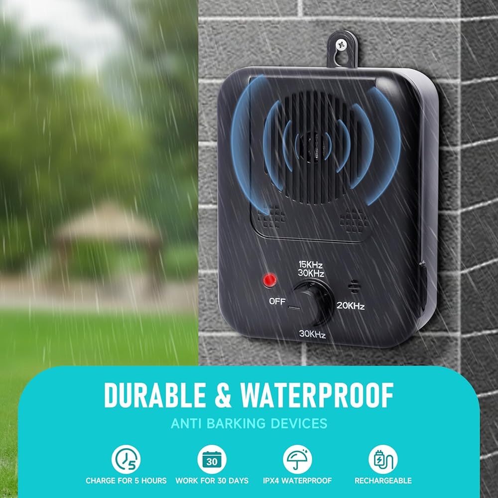 Waterproof&Rechargeable - Built-in 2000mAH battery supports charging via USB cable. It can be used for 30 days after charging for 5 hours. All-weather to create a quiet environment for you. The waterproof level is IPX45, and even in rainy days, our dog barking device can work normally
