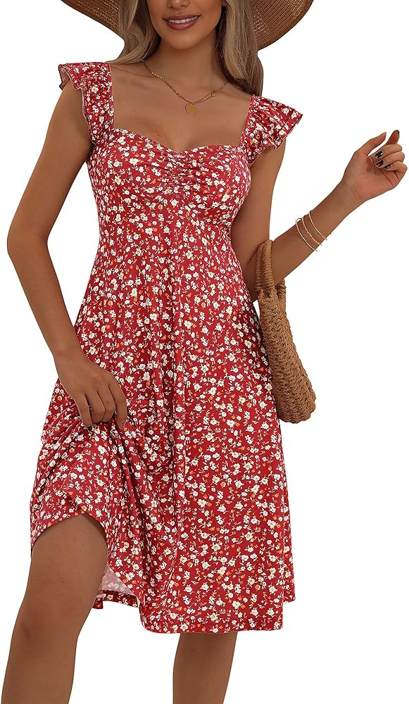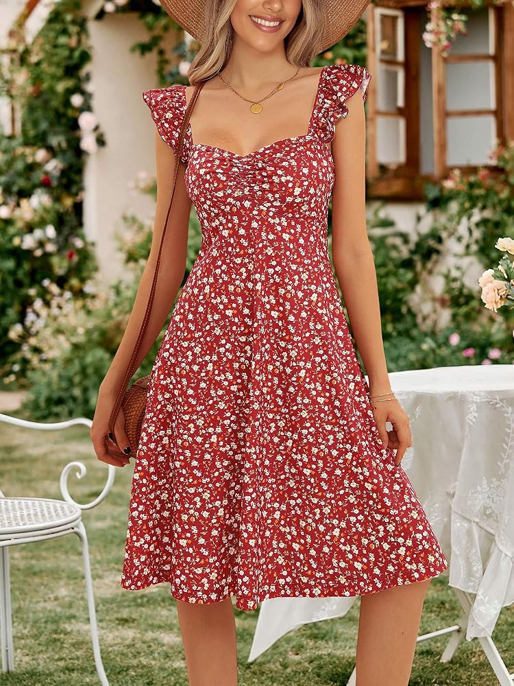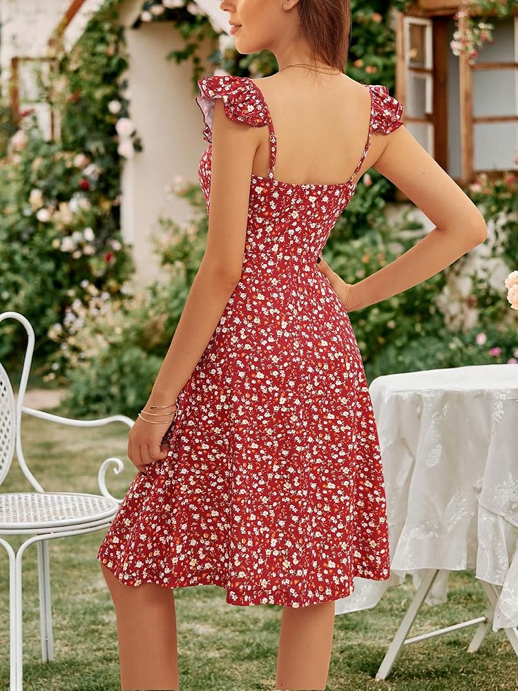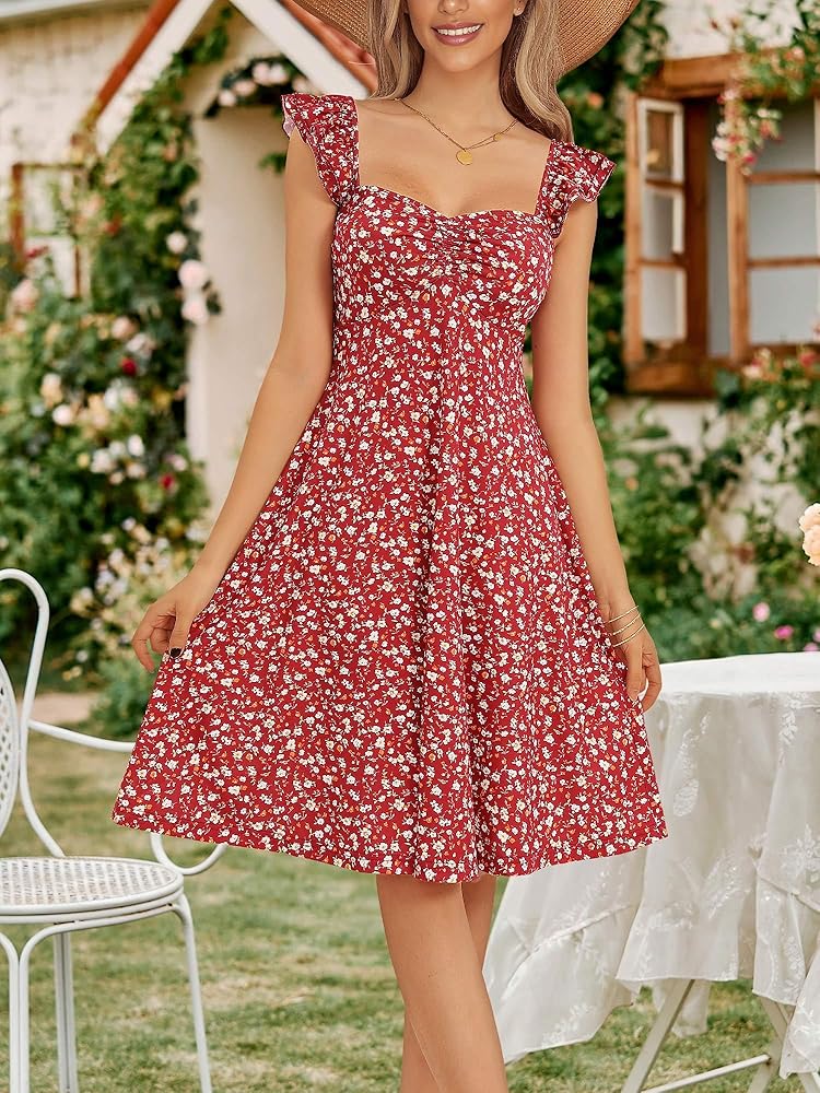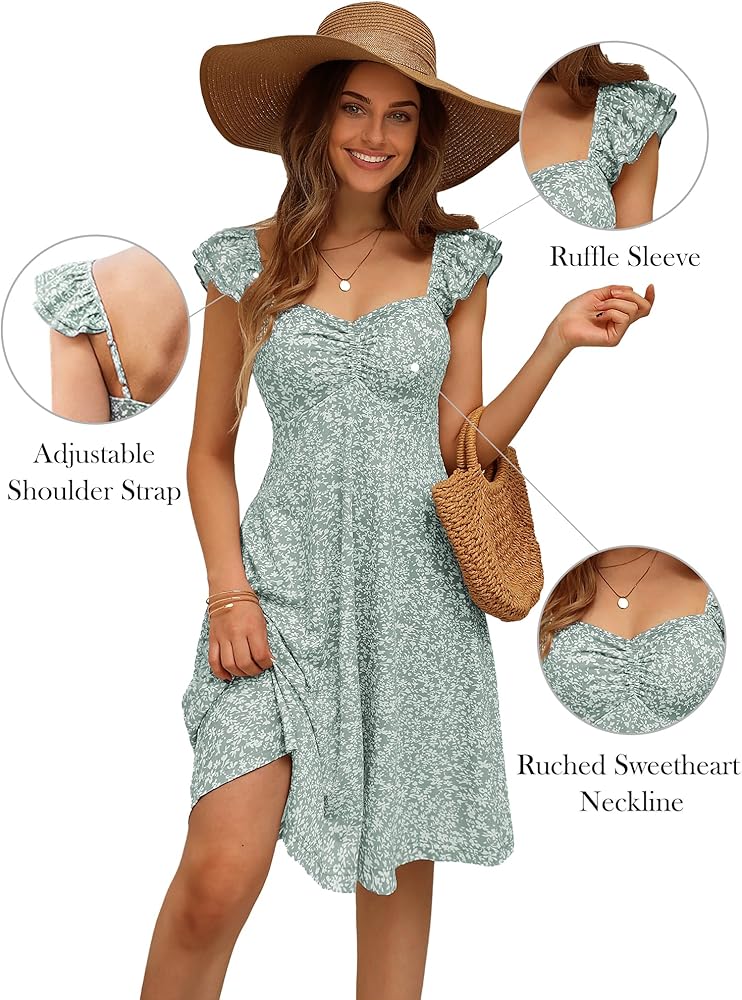 【Features】Our dress showcases a charming sweetheart neckline, adjustable shoulder straps, enhanced with cute cap ruffle sleeves that add a touch of elegance. The floral pattern spread across the dress breathes life into your wardrobe, while the knee-length and A-line silhouette flatter your figure. The empire waist design accentuates your curves, creating a silhouette that's both flattering and comfortable.