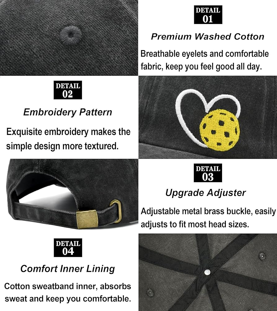 PREMIUM MATERIAL - Our pickleball hats feature simple heart embroidery design, was made of premium washed cotton, lightweight and soft, breathable and comfortable. It's an essential pickleball accessory that combines comfort and fashion.