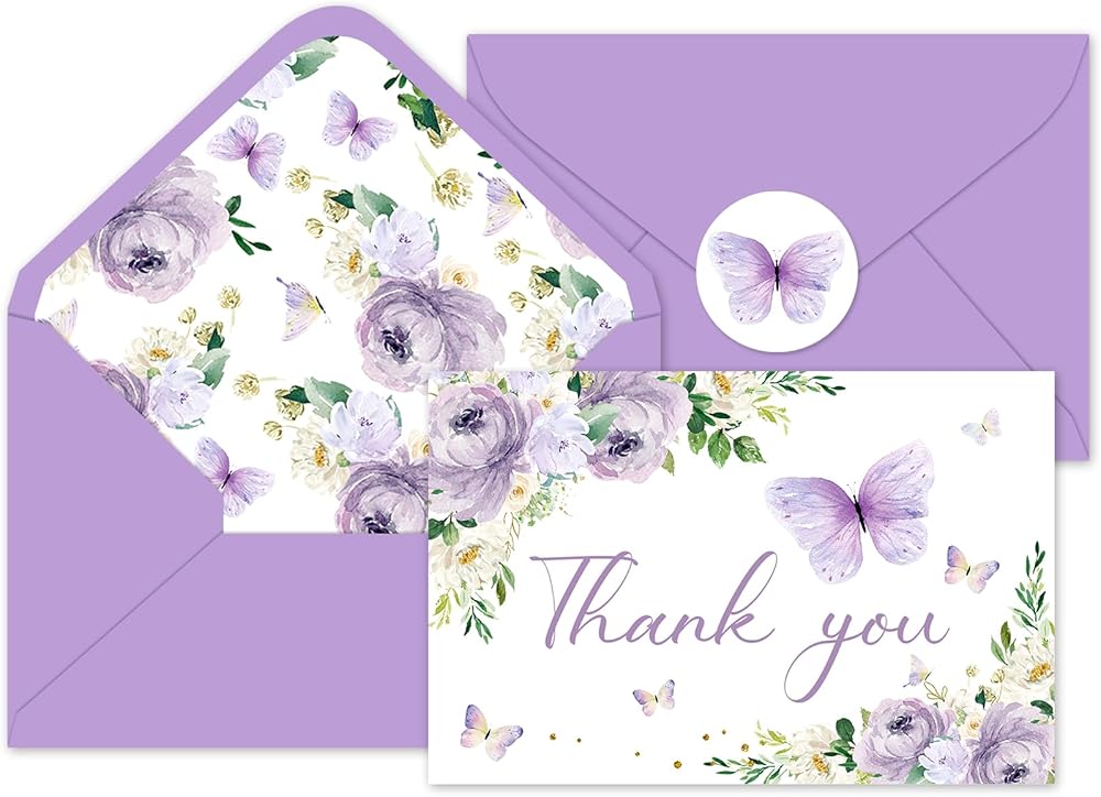 Elegant Design: Patterned with purple butterflies and flowers, printed with the words of thank you, delicate and elegant, suitable for many occasions.