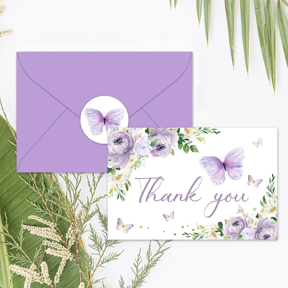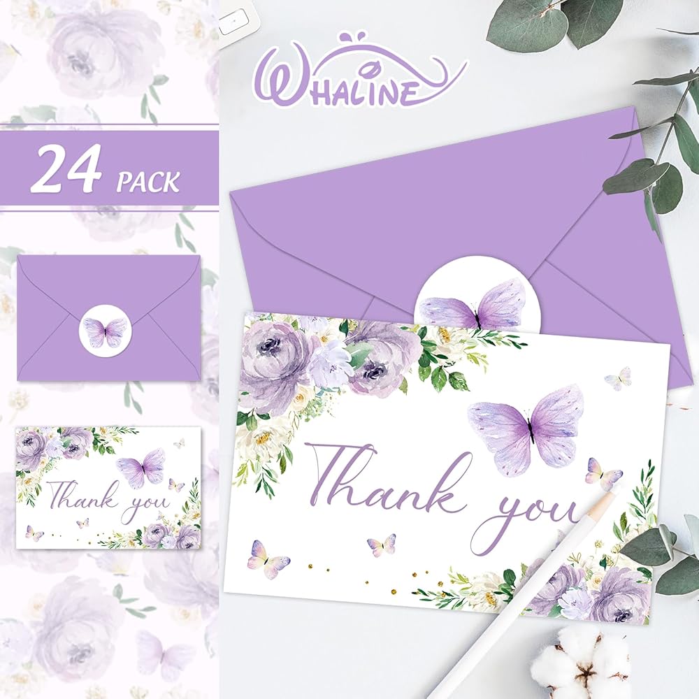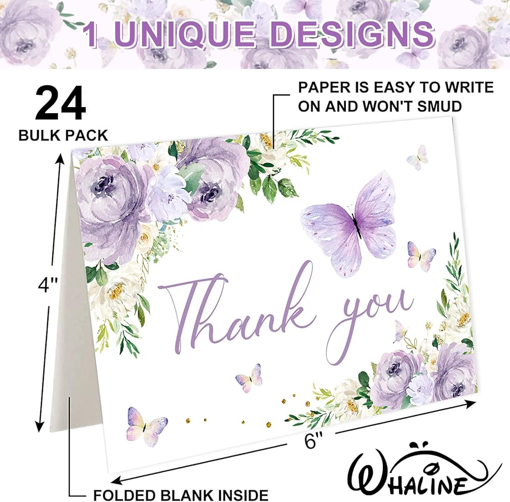 Whaline 24Pcs Floral Butterfly Thank You Cards Purple Flower Greeting Cards with Envelope Stickers Spring Watercolor Blank Note Cards for Birthday Wedding Baby Shower Bridal Shower, 4 x 6 Inch