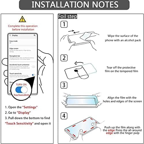 Simple installation: The Samsung Galaxy S23 Ultra screensaver film is easy to install, free of bubbles, and can be removed without residue. The phone screen has no gaps or bubbles, so it does not affect touch sensitivity. Please turn on the touch sensitivity switch before installation. Step: Settings Display Touch Sensitivity Switch.