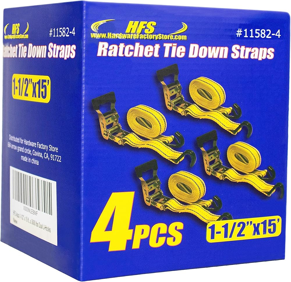 [HEAVY DUTY]: These HFS 1.5" x 15' heavy-duty ratchet straps are not your every-day strap. Unlike our competitors, our straps are made with double-thickness polyester webbing, which not only makes the straps soft so they don't scratch your load, but also makes them strong. The webbing is rot and weather resistance, and won't stretch when wet.These straps offer a 3,000LB breaking strength with a 1,000LB WLL safety rating. The black-painted steel double-J hooks provide a confident latch and won't bend like the cheaper S-hooks on other straps. In accordance with DOT regulations, these straps are made of highly-visible bright yellow webbing so they can easily be seen;