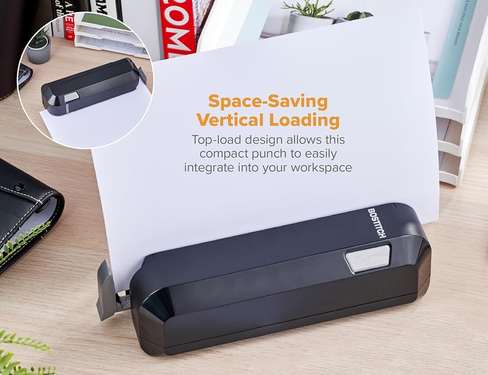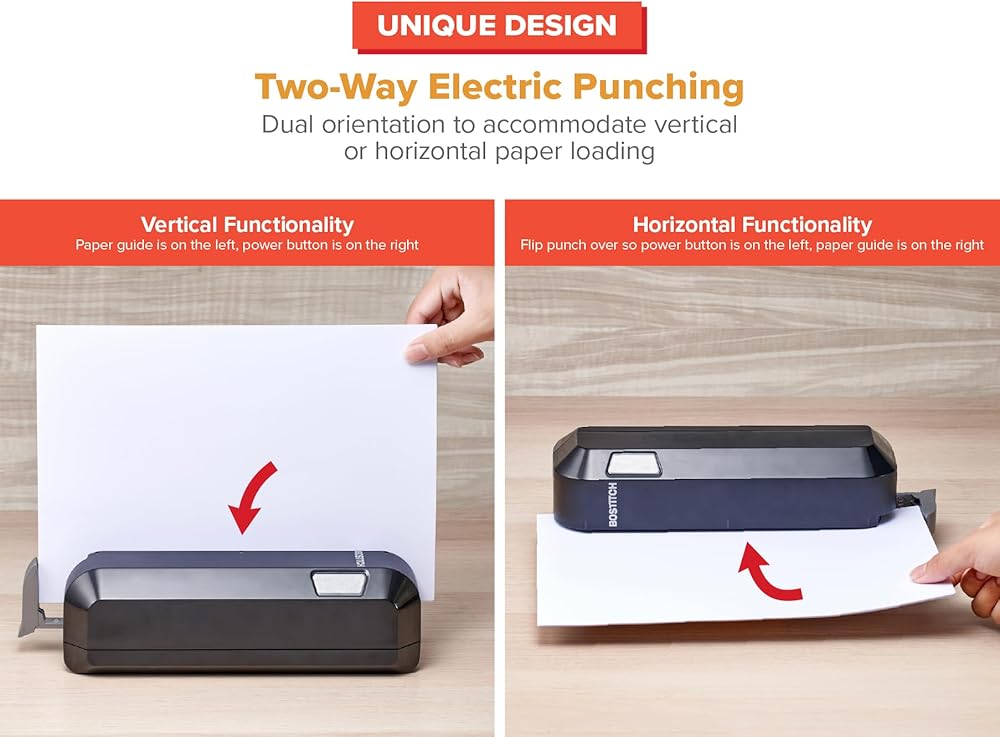 DUAL PAPER LOADING: This is world's FIRST dual loading electric hole punch. Paper can be inserted from the top or front allowing you to save space on your desk.