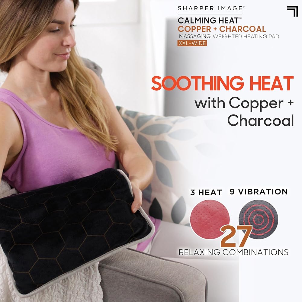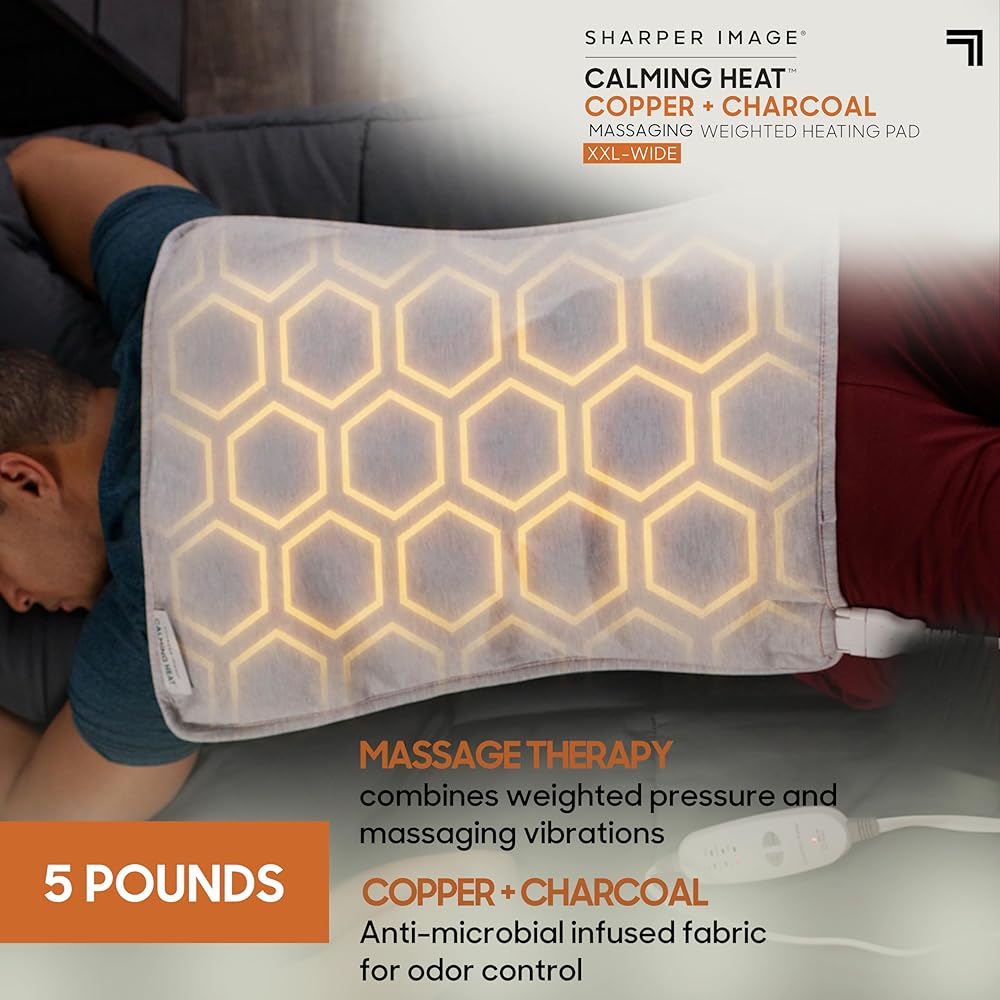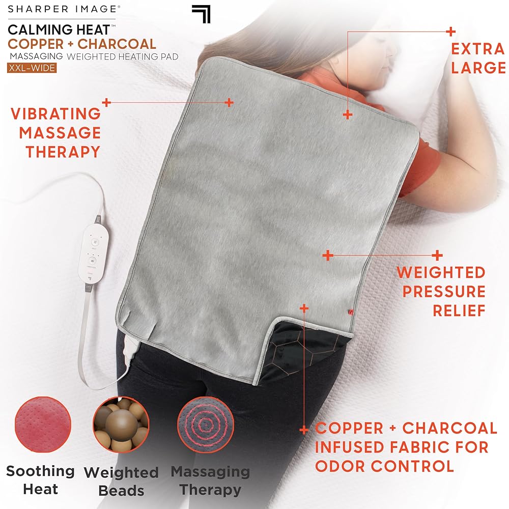WEIGHTED CLAY BEAD FILLING Calming Heat Copper + Charcoal Weighted Heating Contour Pad's high-density comfort fill provides the perfect amount of pressure which provides deep penetrating relief when combined with soothing heat and relaxing vibrations. The 5 pound weighted design provides targeted heat therapy to your joints and muscles, helping to ease aches and pains.