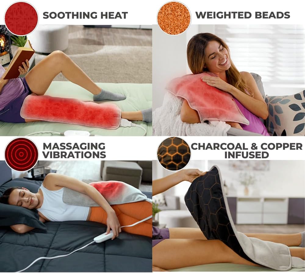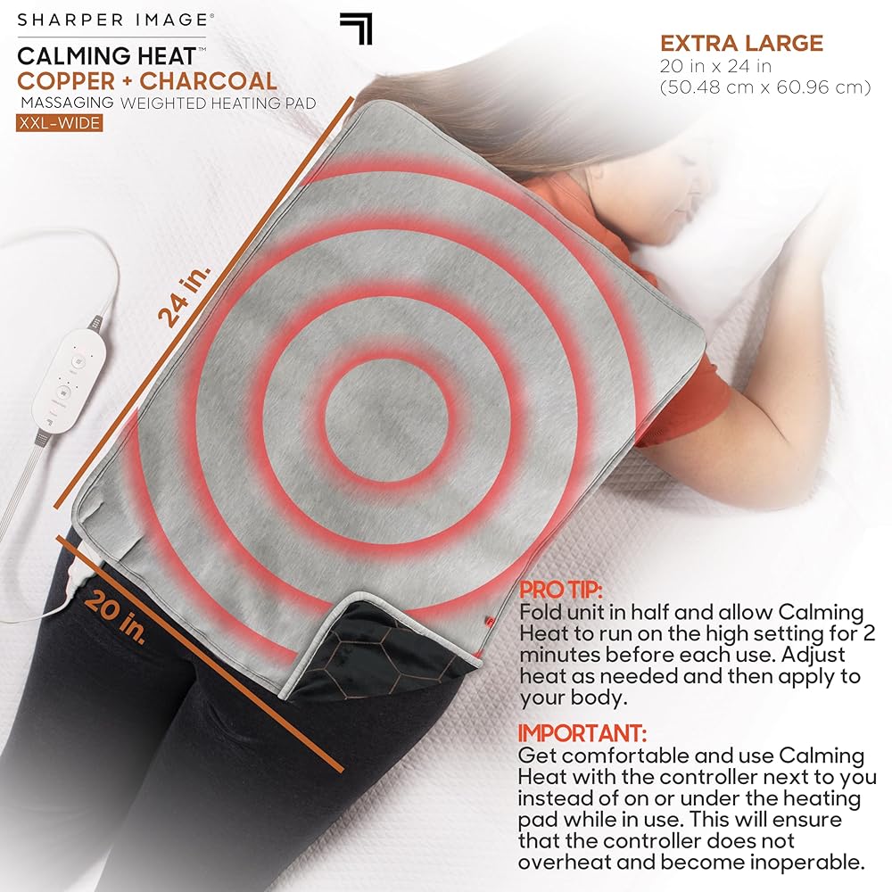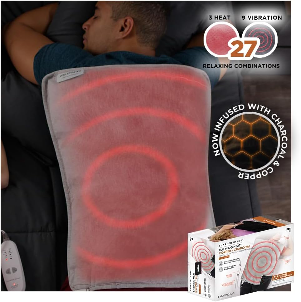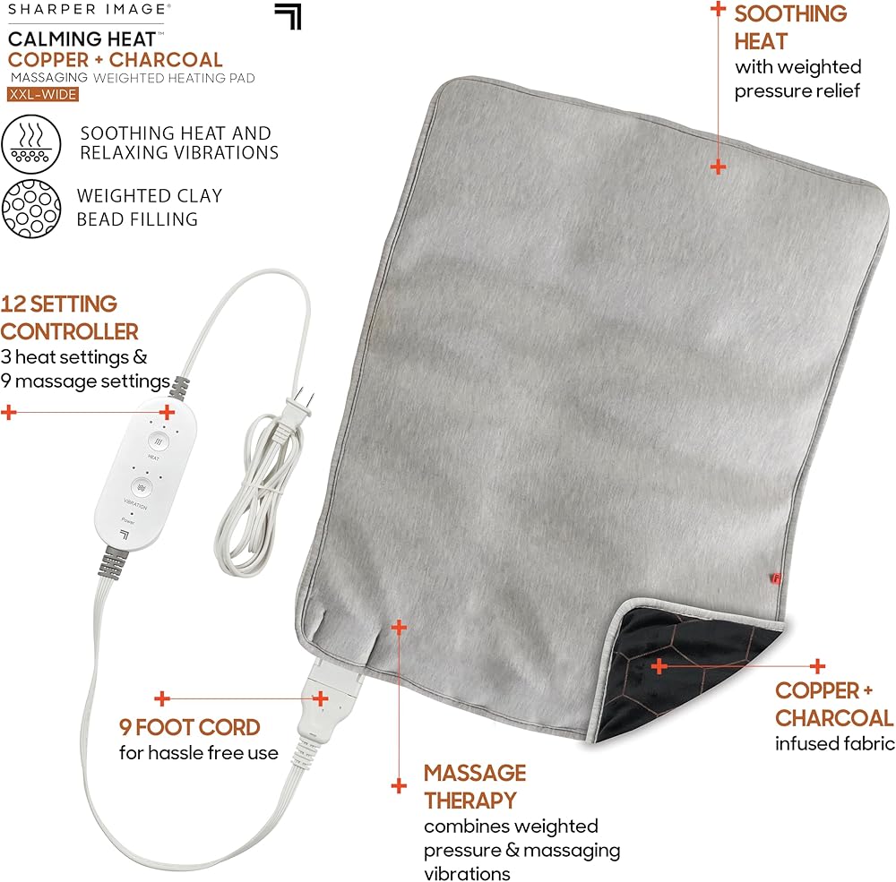 WEIGHTED CLAY BEAD FILLING Calming Heat Copper + Charcoal Weighted Heating Contour Pad's high-density comfort fill provides the perfect amount of pressure which provides deep penetrating relief when combined with soothing heat and relaxing vibrations. The 5 pound weighted design provides targeted heat therapy to your joints and muscles, helping to ease aches and pains.