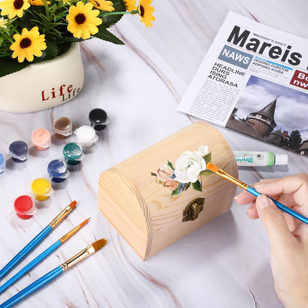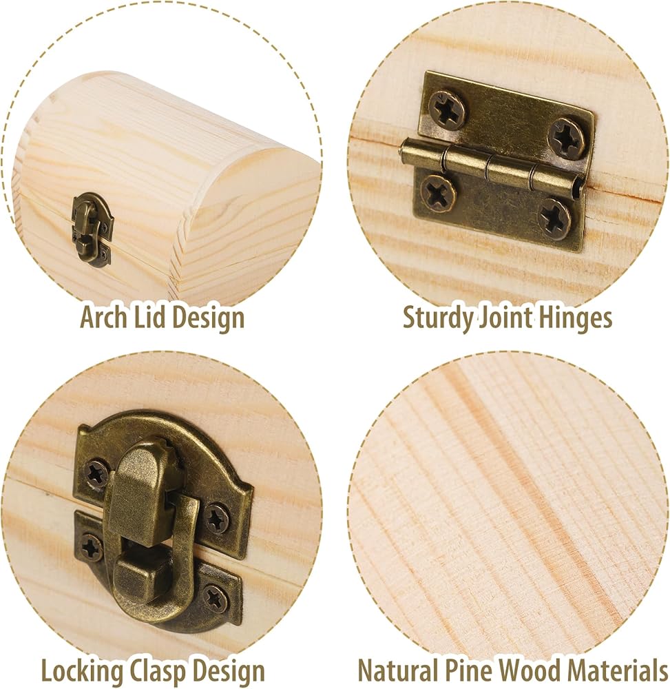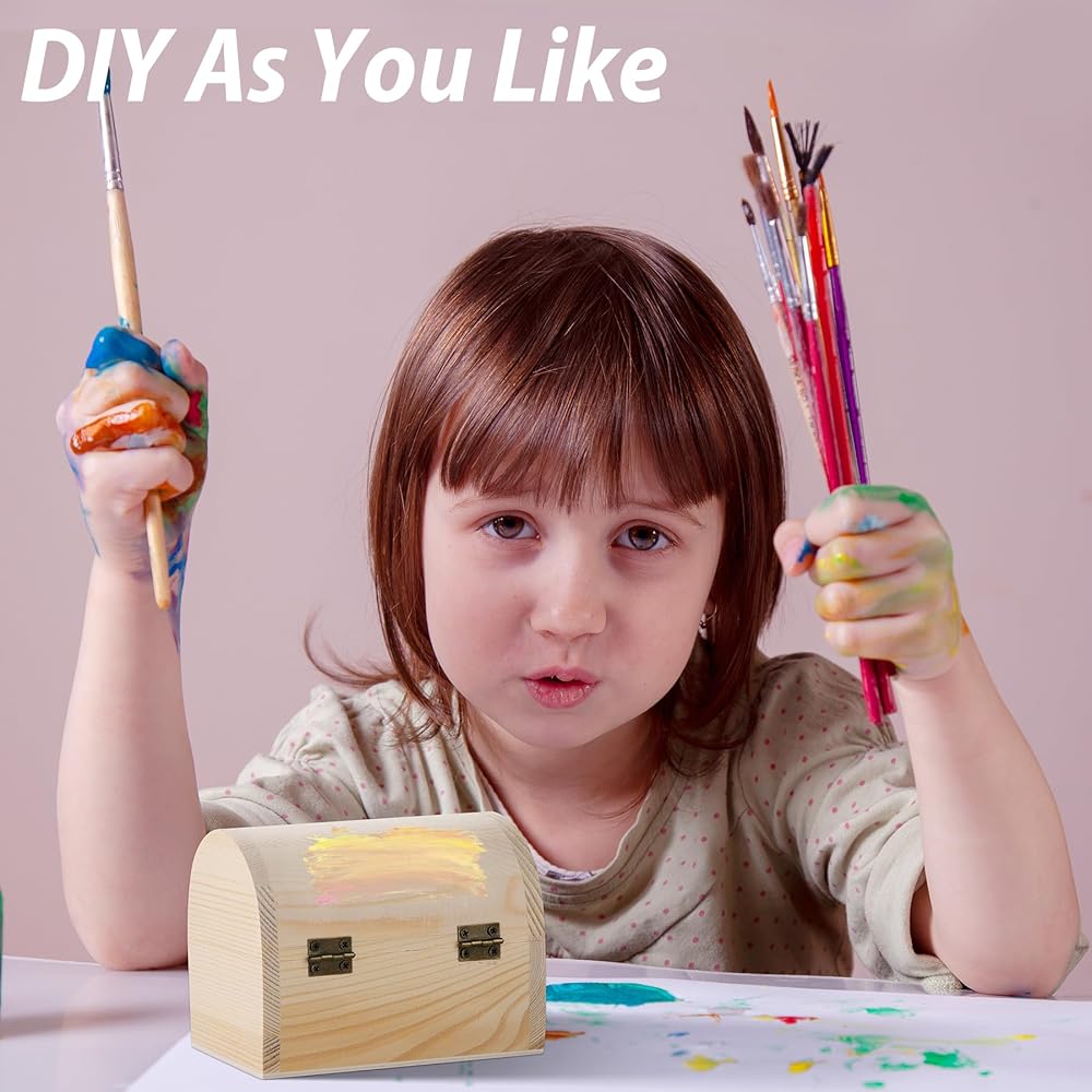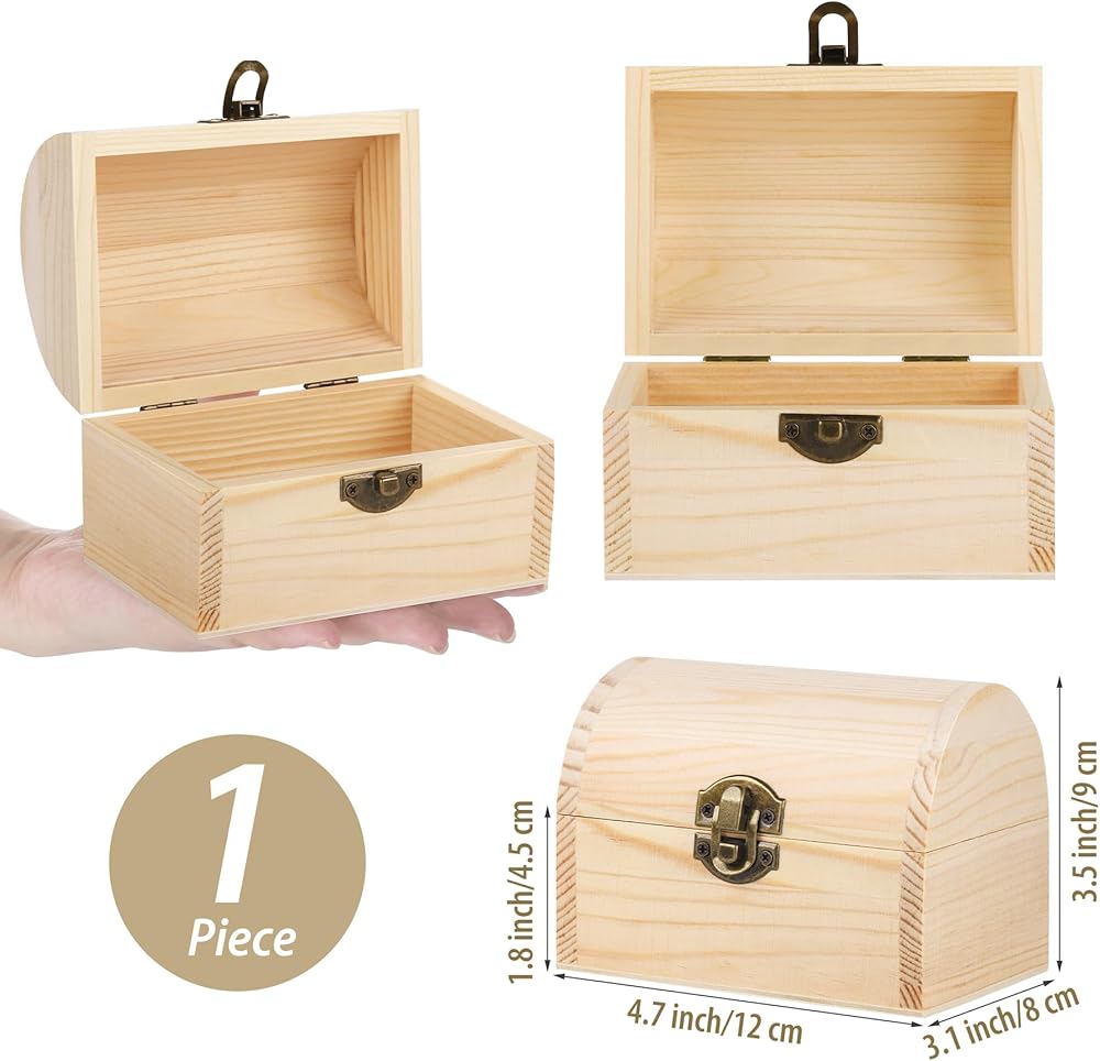 Natural material: The package contains 4 pieces of unfinished wood treasure chests. The decorative wooden box's robust materials increase longevity and durability, making treasure chest decorate pine wooden box a timeless addition to your home or office decor. Proper sized at 4.7 x 3.1 x 3.5 inch (12 x 8 x 9 cm), the wooden decorative box offers ample space for your cherished items, combining elegance with practicality, for holding paints, jewelry, arts and crafts supplies, candy, etc.