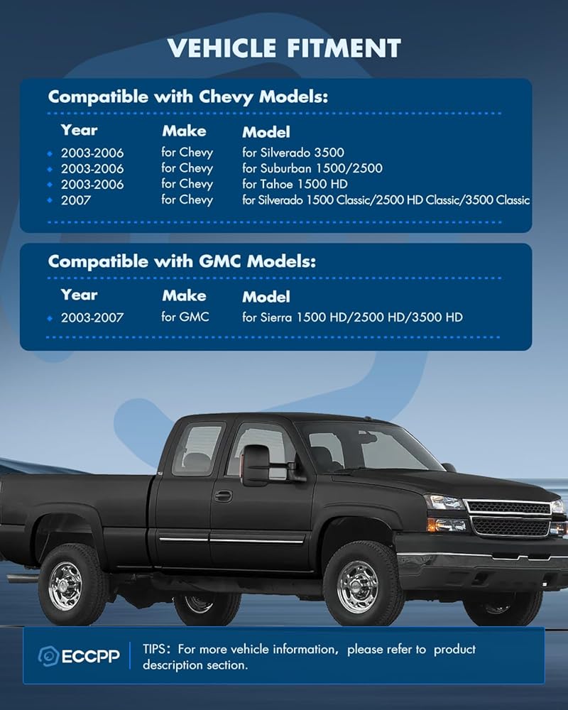 🎁 FITMENT: 2007 for Chevy Silverado 1500 Classic 2500 HD Classic 3500 Classic 2003-06 for Chevy Silverado 1500 2500 HD 3500 for Chevy Suburban 1500 Suburban 2500 for Chevy Tahoe 2003 for Chevy Silverado 1500 HD for Chevy Silverado 1500 HD 2003-04 for Chevy Silverado 2500 2007 for GMC Sierra 1500 Classic for GMC Sierra 2500 HD for GMC Sierra 3500 Classic for GMC Sierra 1500 HD 2003 for GMC Sierra 1500 HD 2003-04 for GMC Sierra 2500 2003-06 for GMC Sierra 1500 for GMC Sierra 2500 HD.