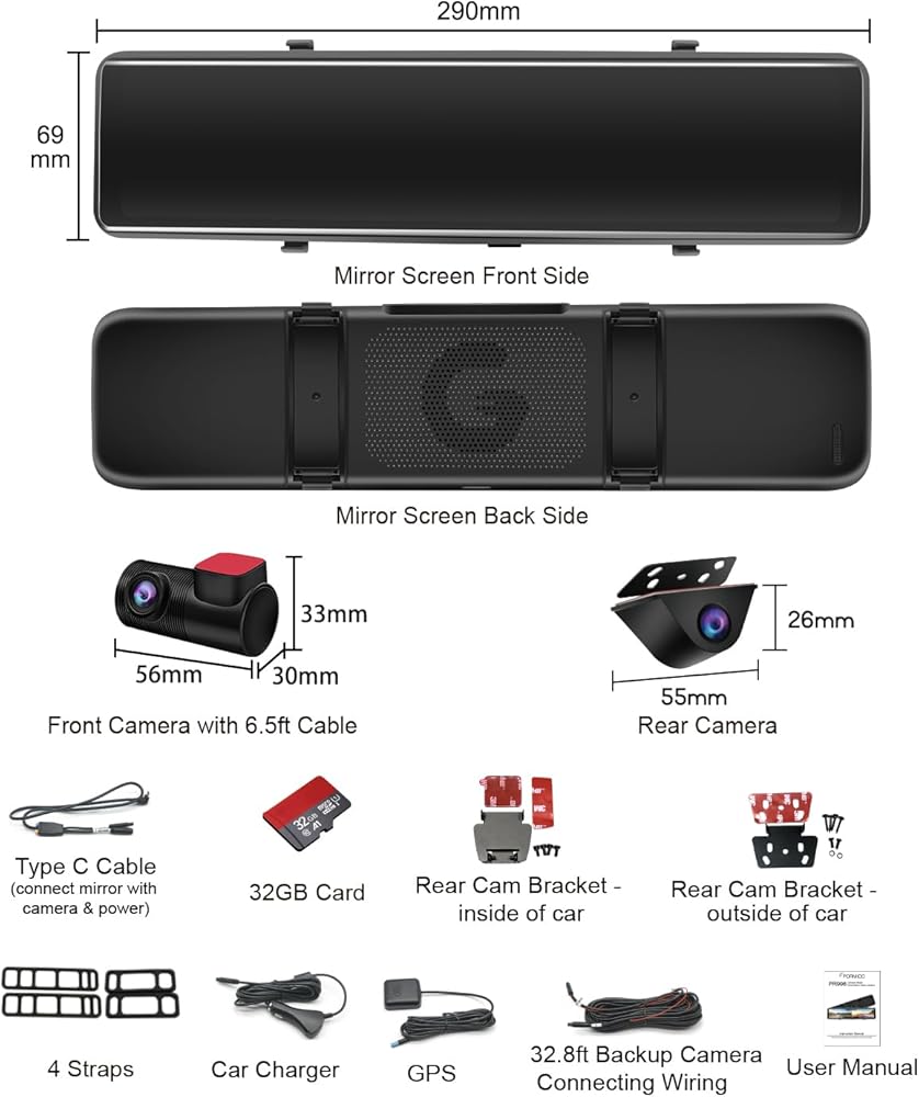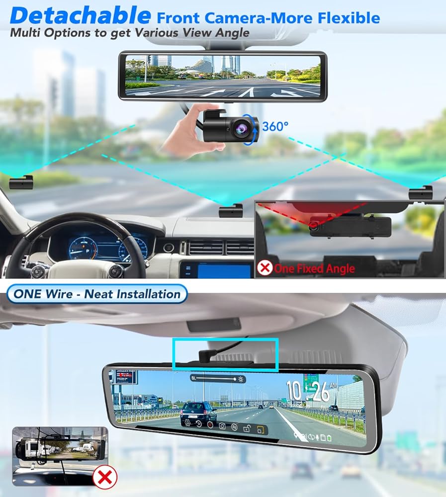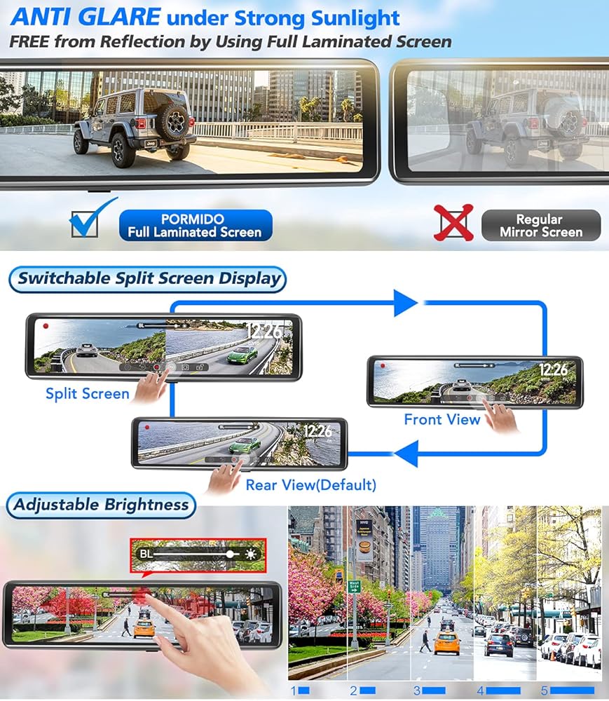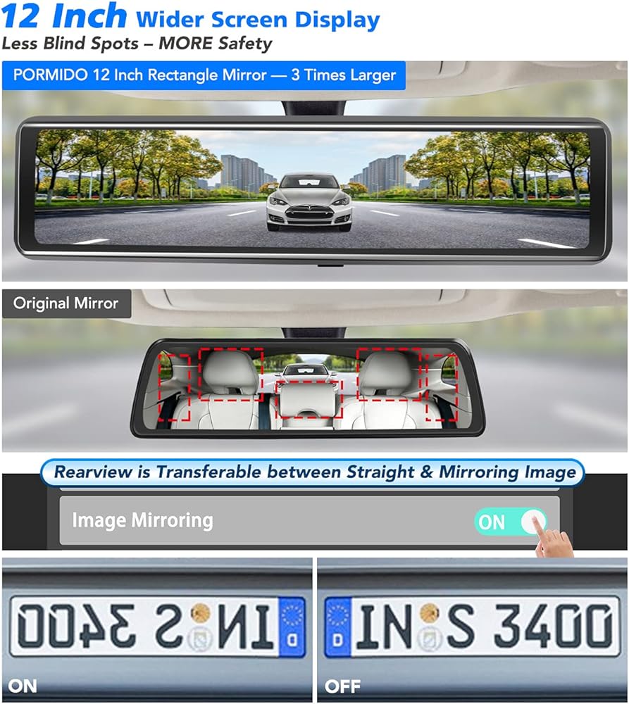 【Industry FIRST 12 inch Split Screen Mirror with DETACHED Front Cam】PORMIDO front lens is separated from the rearview mirror screen,comes with one-meter extension cable, so you can extend it to different areas of the windshield for flexible view. The front lens will NOT be blocked by visor or other devices, then eliminates more blind points of your front vision.