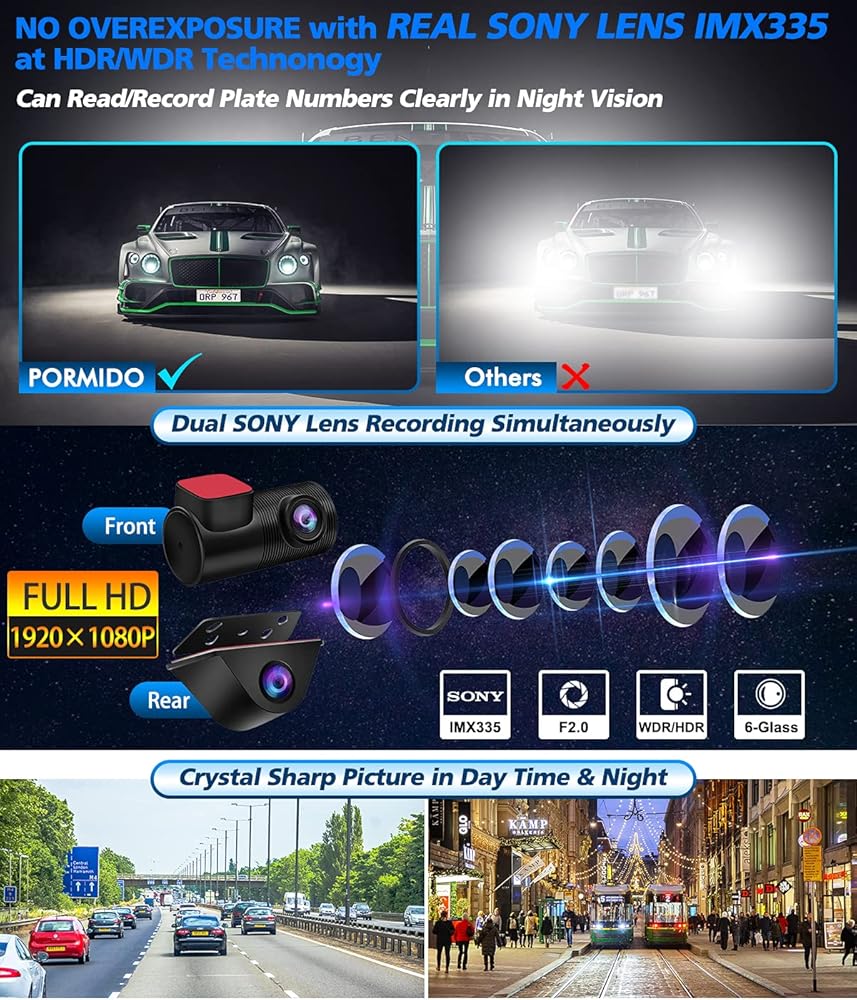 【ANTI Glare & Best Exposure】Different from most dashcams mirror screen, PORMIDO Full Laminated mirror performs perfectly in anti-glaring from sunlight, both front and rear car cameras are equipped with 6-layer glass sensor IMX335 at HDR technology, the image or video will NOT be overexposured by other headlights, so you can see every plate clearly in the night for safe driving.