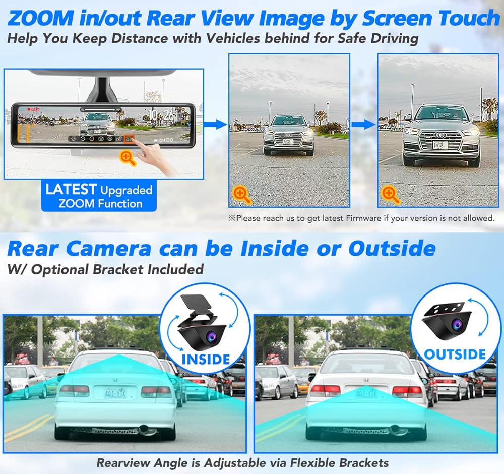 【Zoom Rear Image & ONE wire plug into Mirror】You can zoom in/out the rearview to adjust the rear image size based on actual distance.One wire design looks more tidy from the mirror.Other functions are also included: Loop Recording offers continuous recording even the storage is full,Front and back view displays simultaneously as Split Screen;G-sensor detects every collision and locks the emergency recordings for proof.