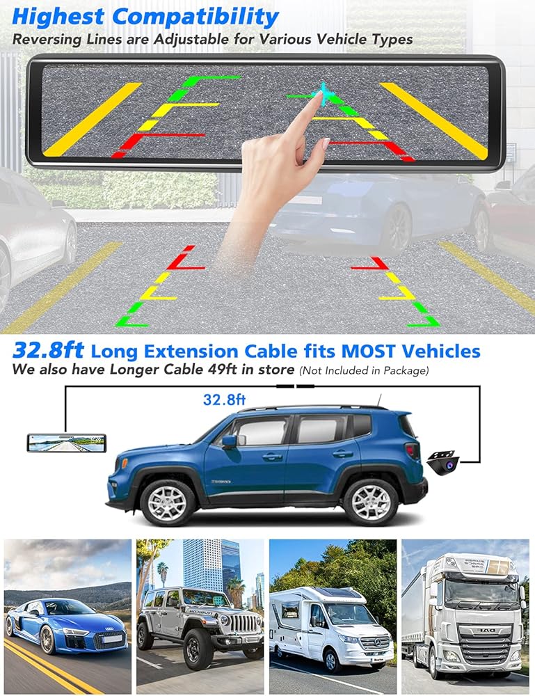 【Adjustable Reverse Lines & Longer Rear Cam Cable 】You can adjust the parking lines to fit your vehicle for easy reversing. The included back cam cable is 33ft long enough for most models.Furthermore,you can order 49ft cable with us(not included) for big truck,trailer,RV,motorhome,pickup,van...etc, please contact us if the included back up camera cable is not long enough for you.