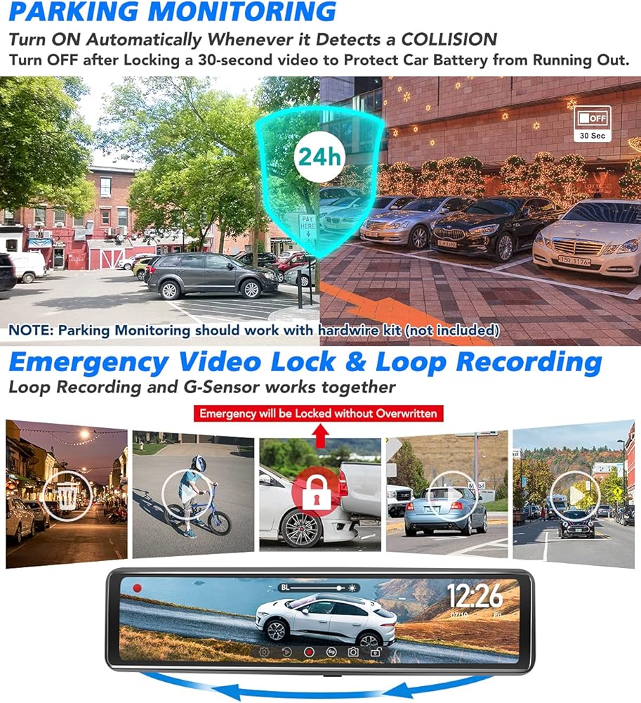 【Parking Monitoring with Protection of Battery】When parking,this hd mirror cam turns on automatically once it detects any collision,then turns off after locked a 30-second emergency video.In this way,the car battery will never be drained out even parked for long time,this should work with hardwire kit(not included).Whenever you have any questions about this digital rear view mirror system,please reach us via the service email in user manual,we'll reply within 24 hours.