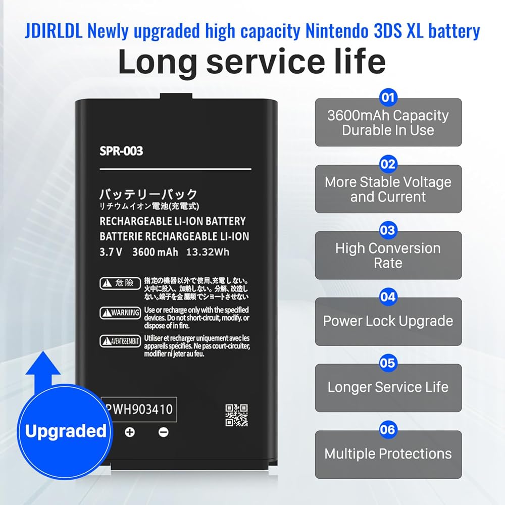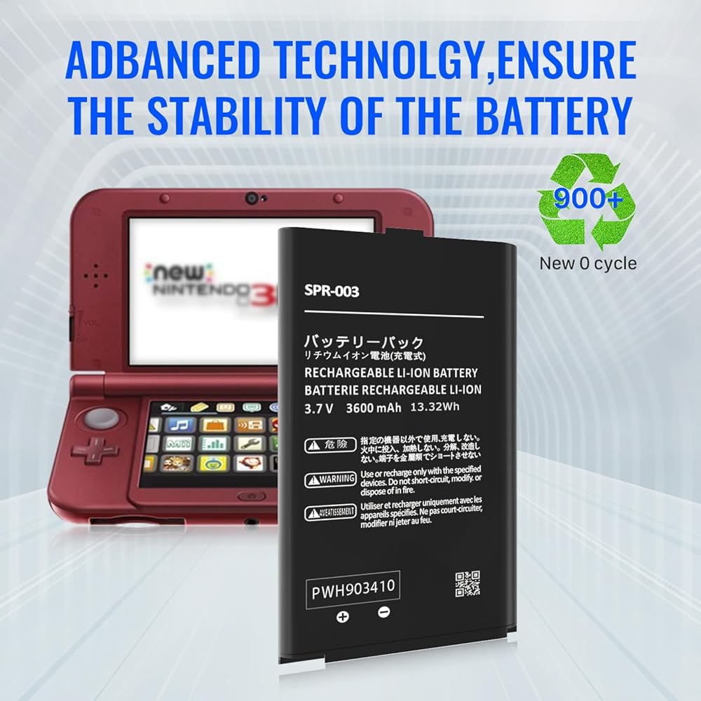 [3600 mAh High Capacity] 🎮: Newly upgraded large capacity is 3600mAh. The SPR-003 replacement battery has a longer and more stable standby time than the original/other batteries,built to last up to 900+ charging cycles to Give the Nintendo 3DS XL Gaming Console a whole new life.