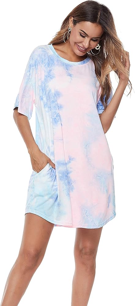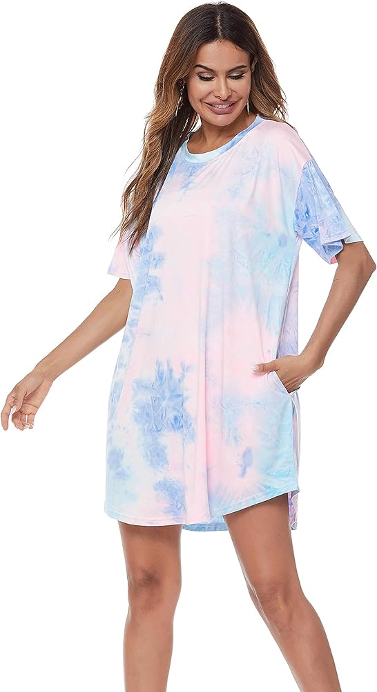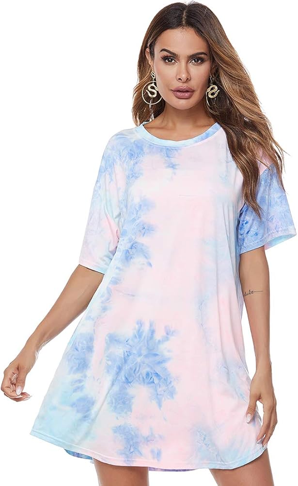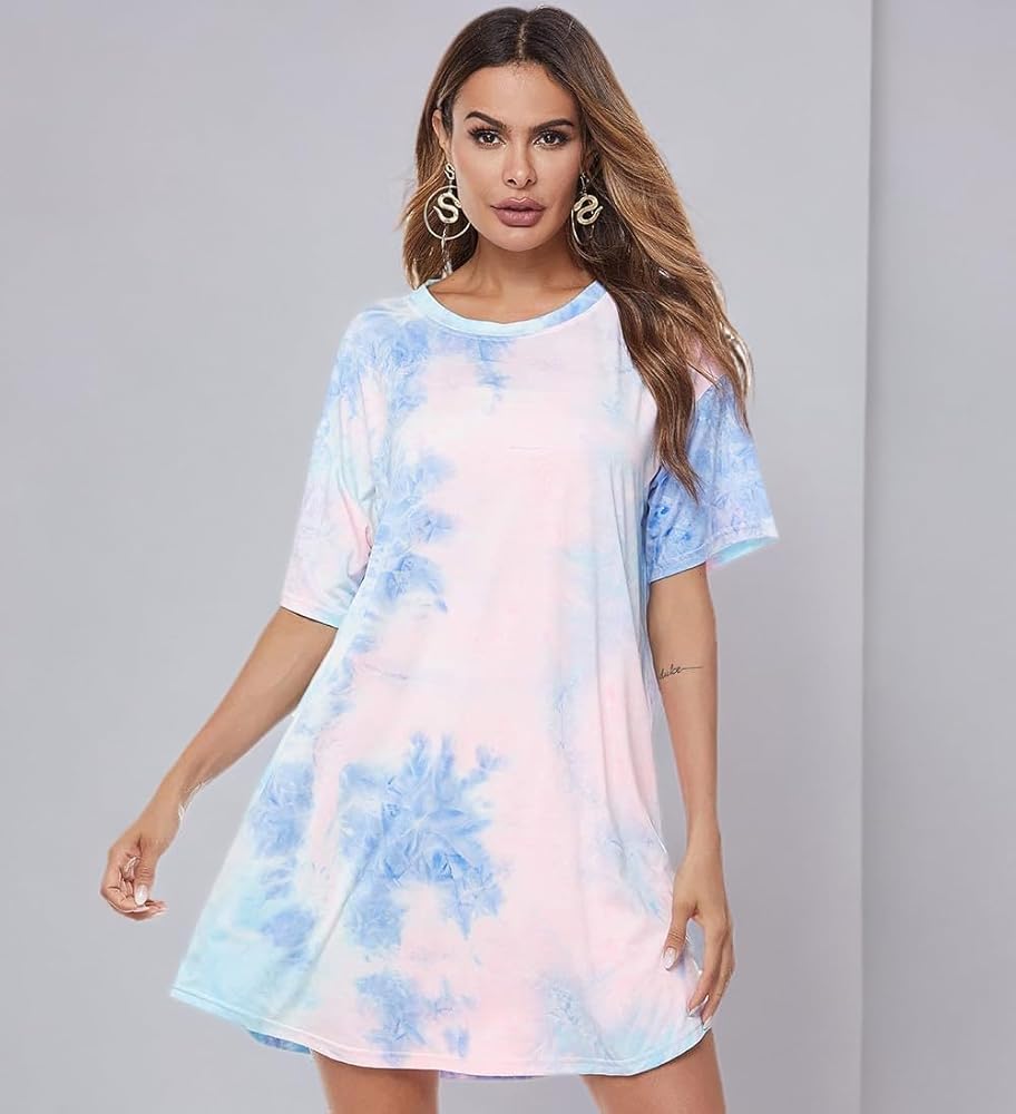 FEATURES: Keep up with the current trends in this colorful dress featuring soft lightweight breezy material patterned with pink lightweight breezy material patterned with pink, blue/green, and yellow tie-dye, a rounded neckline, short loose sleeves and a relaxed silhouette that falls into a rounded mid-thigh length hemlinel.