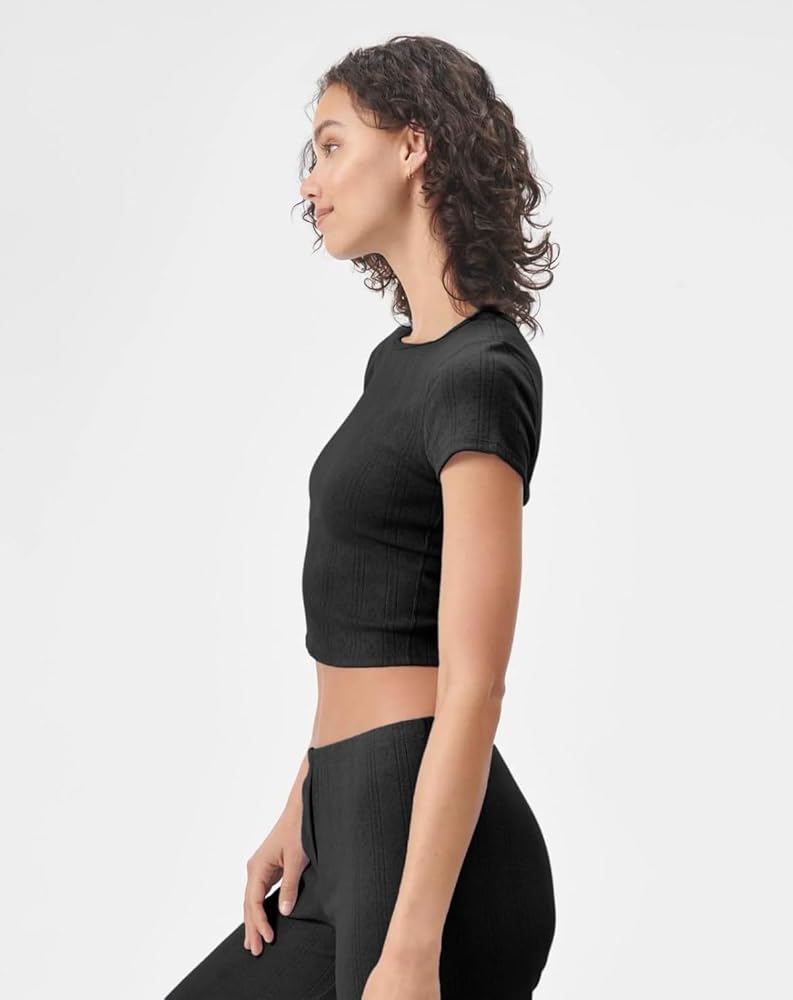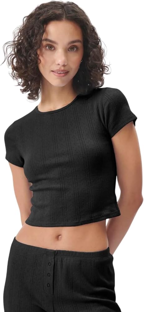 Soft pointelle tee shirt. Scallop details on crew neck line.