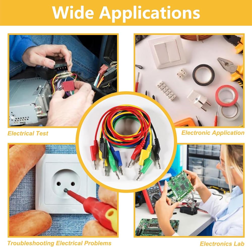 ELECTRICAL MULTIMETER TEST KIT: Test leads are composed of 22 AWG soft flexible copper wires, each having a stackable banana plug at ends. Voltage: 1000V. Current:15A. Banana Plug: 4 mm. Lead length: 3.3ft.