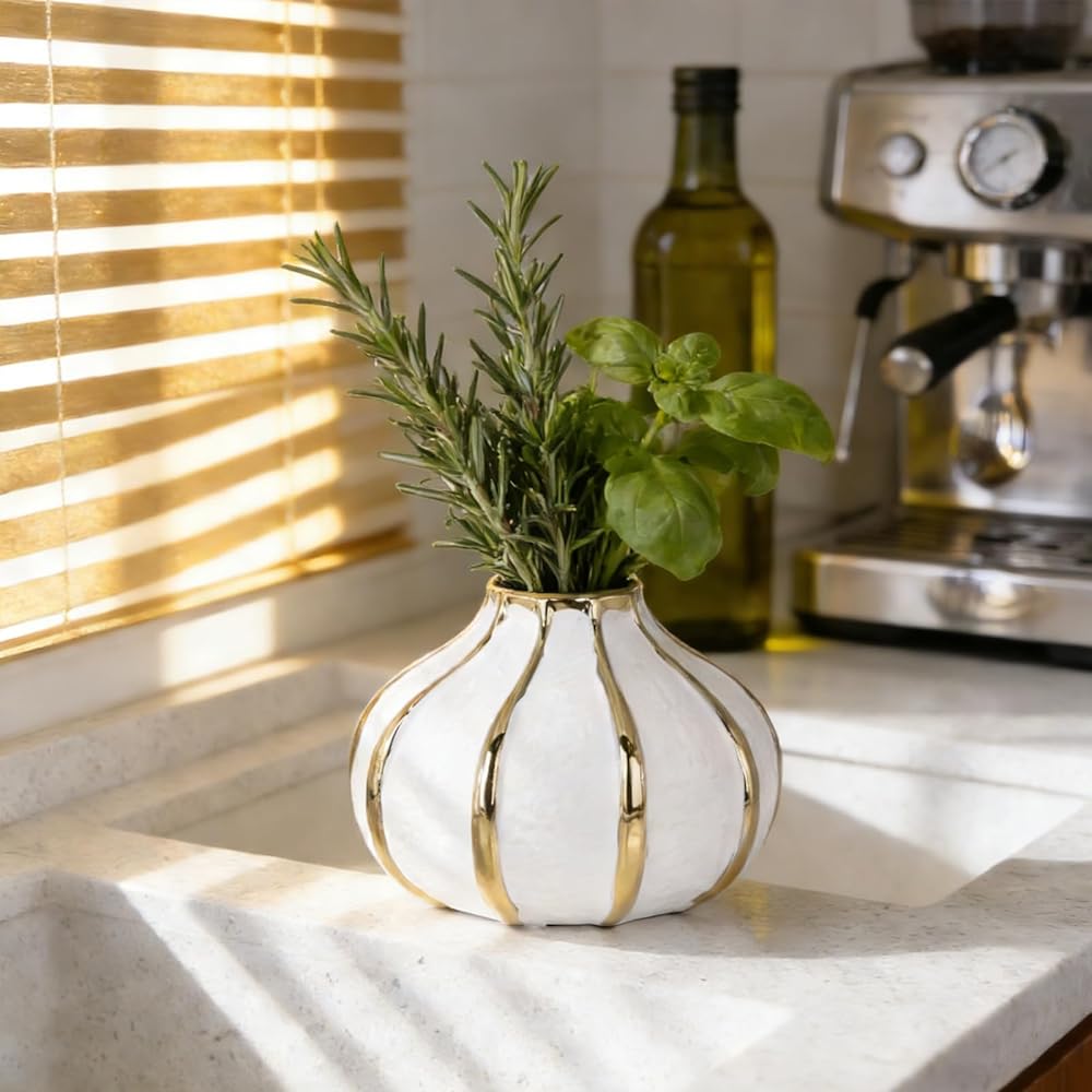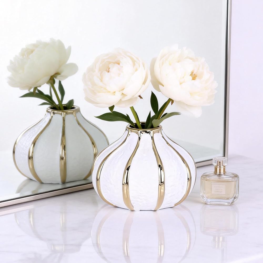 Introducing our stunning ceramic vase inspired by the enchanting allure of Flower buds. With its distinctive round shape and textured matte surface, this vase offers a unique blend of contemporary design and classic charm. The golden border adds a touch of luxury, making it an exquisite decorative accent. Designed specifically for short-stemmed flowers, this Flower buds-shaped vase is a perfect choice for creating delightful arrangements. Its ceramic composition ensures excellent water retention, allowing your flowers to thrive and brighten up any space. This versatile vase is not limited to floral arrangements alone. It effortlessly enhances the modern mid-century aesthetic, making it suitable for adorning your dining table, creating captivating centerpieces on your coffee table, or adding a touch of elegance to your entrance, living room, coffee shop, or farmhouse-inspired space. Its unique shape, textured surface, and golden border make it a captivating decorative piece that elevates your interior décor. Please note that due to the nature of the handmade process, there may be slight color variations and imperfections in each vase. These variations add character, depth, and a sense of uniqueness to the vases. Embrace these subtle differences as they make your vase truly one-of-a-kind. We believe in transparency and honesty, and we want to ensure that you make an informed decision. If you prefer flawless and uniform vases, we kindly request that you opt for alternatives. However, if you appreciate the beauty of imperfections and the unique qualities of handmade creations, our ceramic vases are perfect for you.