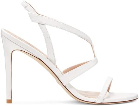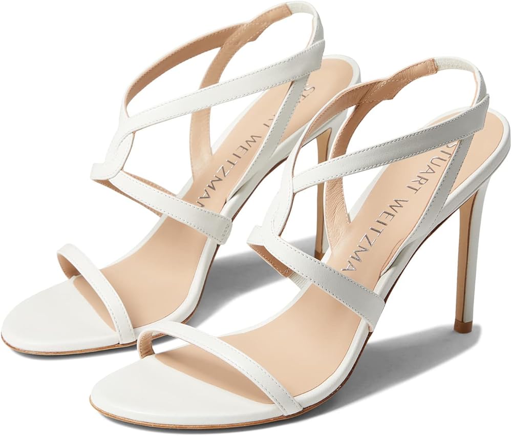 Featuring a sleek wavy strappy upper, the Stuart Weitzman Soiree 100 Sandal looks chic and elegant. It is a versatile addition to your heel collection! Leather upper, lining, and insole. Slip-on style. Contrasting open round toe. Stiletto heel. Branded footbed. Leather outsole. Made in Spain.